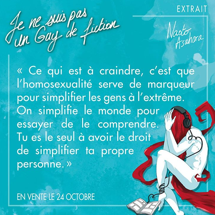 Enfin, le 6 septembre 2019, Akata signe l’édition de sa quatrième Light Novel avec Je ne suis pas un gay de fiction du jeune écrivain homosexuel, Asahara NAOTO. Ce dernier a décidé de faire son coming-out après le succès de son roman. Au Japon, le roman a déjà eu le droit à son adaptation en manga et en drama. Pour la couverture française du roman, Akata a collaboré avec Yôjirô ARAI, habituellement illustrateur chez Square Enix, pour retravailler la couverture et lui donner un ton un peu plus grave et réaliste que la couverture originale, par rapport au sérieux du sujet abordé, à savoir la vie secrète d’un lycéen homosexuel.