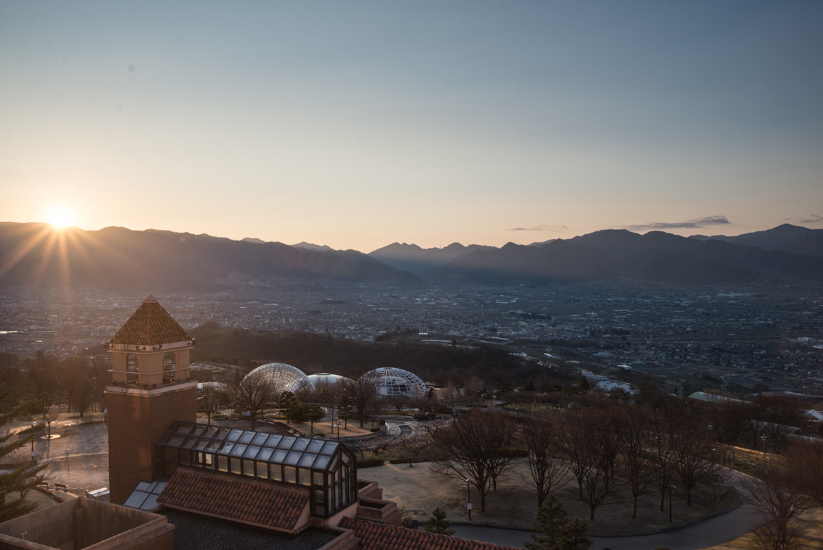 Le soleil se lève sur Yamanashi et les dômes du Fruit Park.