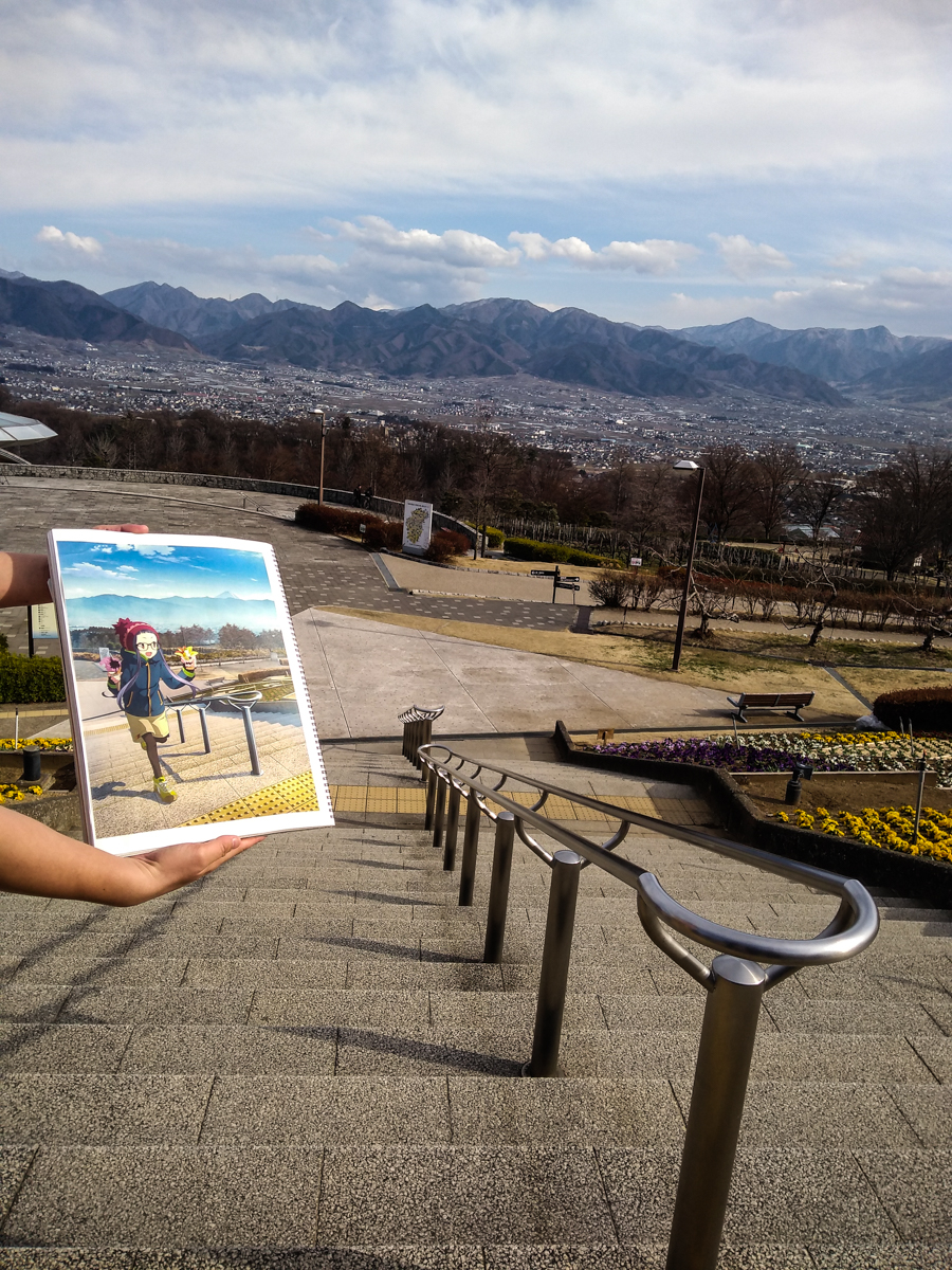 Comme on l’a déjà dit en introduction, la culture des fruits est l’une des spécialités de Yamanashi. C’est justement sur les hauteurs de la ville que l’on trouve certains vergers et serres. On y trouve aussi le parc à fruit Fuefukigawa que visitent Nadeshiko, Chiaki et Aoi dans l’épisode 4. Ce parc offre, sur sa terrasse, une belle vue dégagée sur la ville, située en contrebas dans la vallée et, en face, sur le mont Fuji. Le parc abrite aussi de grands dômes de verres dans lesquels on trouve un musée du fruit ainsi que le café dans lequel s’arrêtent nos 3 héroïnes. On peut ainsi s’y délecter des même desserts glacés, préparés avec les fruits produits localement, dont une excellente glace au raisin et un monumental parfait aux fruits !