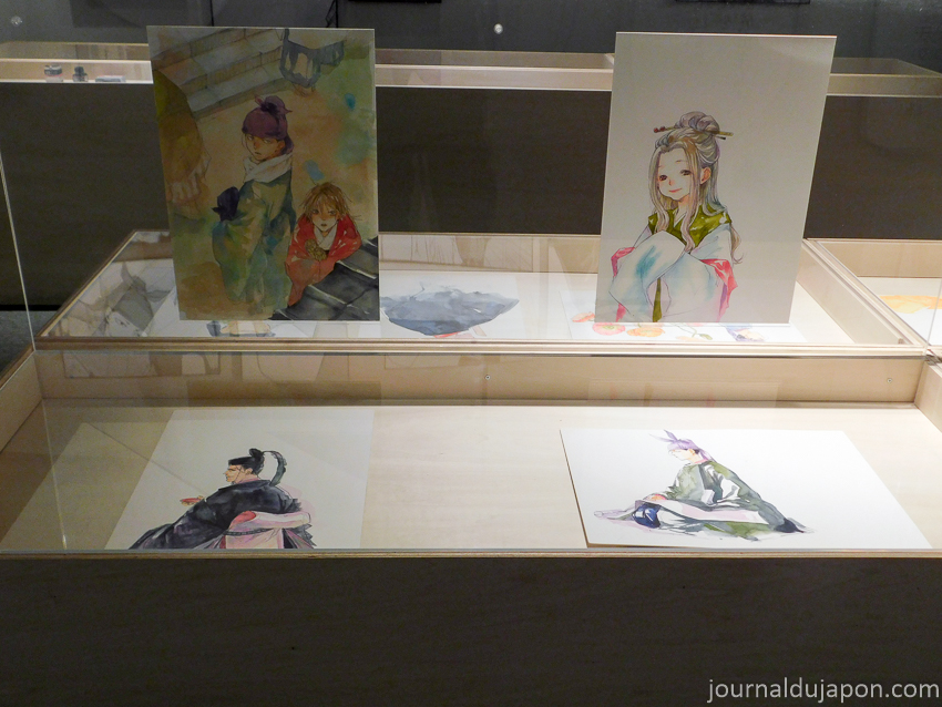 Au Japon, se rendre au musée, ce n’est pas seulement y observer des œuvres, c’est aussi marcher dans des bâtiments qui, eux-mêmes, ont un passif historique (temples, châteaux, ancienne école réhabilitée, copie restituée d’un bâtiment ancien…). Ainsi, la photo ci-dessus a été prise au printemps dernier, à Kyûshû, dans le Pavillon du Trésor du temple de Dazaifu Tenmangû qui consacrait une exposition à Ôten no mon, un récit historique de la talentueuse Yaku Haibara (récompensée en 2017 aux 20e Japan Media Arts Festival dans la catégorie Nouveaux Talents – même si cela fait déjà plus de 13 ans qu’elle dessine de façon professionnelle !). Le manga moderne, dans un mélange de papier et d’outils numériques, cohabitait ainsi avec différents vestiges de la culture nipponne, qu’il s’agisse de vêtements, d’armes ou d’objets du quotidien. « Entre tradition et modernité », comme se plaît à répéter la presse généraliste de façon caricaturale depuis plusieurs décennies.