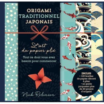 Il existe de nombreux ouvrages sur l’origami. Celui-ci est présenté sous forme de coffret comprenant un recueil avec explications et modèles et un bloc de 120 feuilles (carrés) aux motifs japonais variés (animaux avec des koï, des grues, végétaux avec des bambous et des gingko, fleurs de cerisier ou de prunier, motifs géométriques traditionnels).