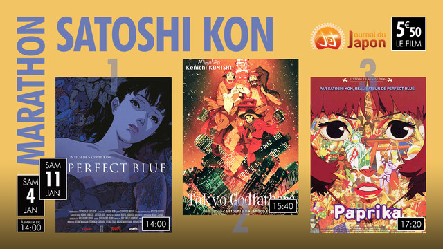 Pas un, ni deux mais 3 films de Satoshi Kon vous attendent pour un marathon au Cinéma le Brady, à Paris, les samedi 4 et 11 janvier prochain… 2 fois 2 places (pour le gagnant et le +1 de son choix) sont à gagner sur la date du 04/01 et 3 fois 2 places (idem) sur la date du 11/01. Nous vous en parlions il y a quelques jours avec le propriétaire des lieux, voici les 3 films qui vous attendent :