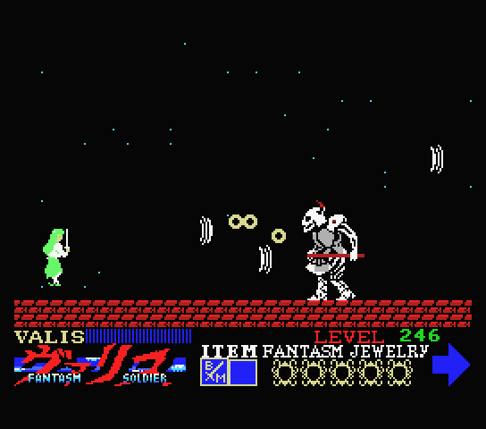 En août 1987, Valis quitte les ordinateurs pour atteindre la Famicom de Nintendo. Celui-ci reprenait les bases des jeux précédents et le mélange d’action et plate-forme, mais ajoutait un coté exploration plus prononcé du fait que l’on pouvait totalement aller dans des endroits sans intérêt pour la suite de l’histoire. On obtenait des objets dans des boutiques, notamment pour pouvoir attaquer les ennemis (on peut gagner des bombes dans le premier niveau… ah, les jeux 8 bits et leurs logiques parfois étrange !)