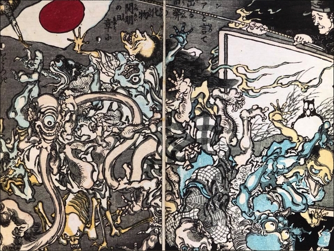 «J’aimais bien aussi la vitrine sur les yōkai où là aussi on ne présentait pas uniquement sur le mode anecdotique. Nous expliquions pourquoi il y avait autant de représentations de yōkai à l’époque Meiji. Parce qu’en fait, c’était une façon d’exorciser la peur. En fait, nous ne disions pas que Meiji était juste une marche triomphale du Japon vers la modernité. Cela s’est fait au prix de contraction sociale terribles et de douleurs pour la société japonaise et donc, nous voulions montrer tout cela. Je trouve que l’exposition était à la fois instructive et amusante avec notamment les passages avec Kyosai Kawanabe et les yōkai. Il y avait une diversité de propositions assez incroyable, avec des prêts inouïs et tout cela dans un espace pas gigantesque.» explique Sophie Makariou.