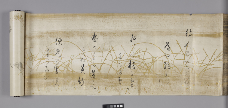 Si une seule œuvre pouvait être sauvée d’un incendie, Sophie Makariou choisirait parmi toute la collection du musée, le grand rouleau japonais de Hon’ami Kōetsu (1558-1637) du début de l’art Rimpa acquis en 2014 par le MNAAG. Cette nouvelle anthologie poétique selon le modèle de l’époque de Heian (794-1185) est pour elle la quintessence de ce que le Japon peut faire de sublime. Elle qualifie cette grande calligraphie et cette poésie waka « d’herbes légères » et admire « la main très souple qui calligraphie avec un ductus très léger qui se détache sur un fond d’or et de mica ». Tout le long des 9,5 mètres du rouleau, le décor change au gré des saisons. Il est exceptionnel aussi par le fait qu’il n’a pas été découpé. En achetant cette œuvre, le musée Guimet est entré dans un assez petit club de musées à avoir l’un de rouleaux de Hon’ami Kōetsu non découpés (une vingtaine seulement dans le monde) et dont la plupart ont été montés en kakemono.
