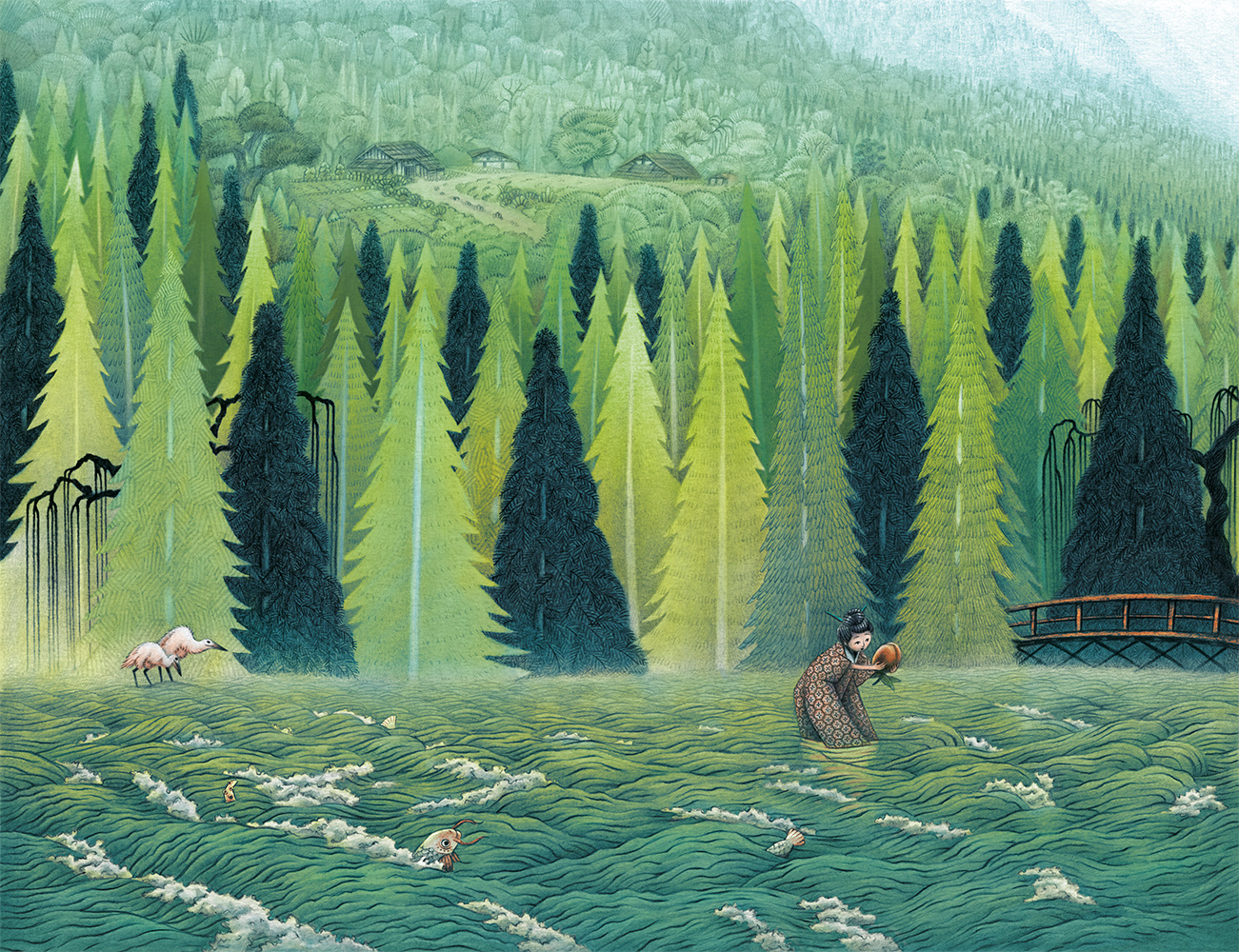 Ce très bel album, qui s’adresse à des enfants un peu plus âgés, entre 9 et 10 ans, a plusieurs niveaux de lectures qui font sa richesse. Le dessin au pinceau et à l’aquarelle de François PLACE est une splendeur parfaitement adaptée au contexte de l’histoire : chacune de ses illustrations pourrait être un dessin d’Hokusai.