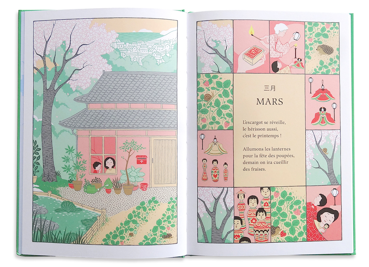 Mois après mois, nous nous plongeons dans l’intimité d’une famille japonaise, et découvrons les particularités d’une vie au fil des saisons. Un après-midi pluvieux, une promenade en forêt, un goûter pris en bord de mer, chaque situation révèle un potentiel éminemment poétique, empreint de simplicité et de sérénité. Une façon toute japonaise d’appréhender chaque instant et dont émane une grande douceur, incarnée par les dessins de Sandrine THOMMEN et portée par les mots de Nathalie DARGENT.