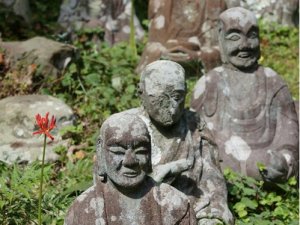 Rien ne vient donc perturber le regard qui se perd dans des paysages de graviers, rebondit sur des boules de mousse ou dans des dédales de roches, nage avec les carpes koï ou se perd au milieu de dizaines de statues. Statues qui sont très présentes tout au long du livre, seules ou en grand nombre, comme endormies depuis des siècles et recouvertes de mousse, ou au contraire en groupe, bien éveillées, presque en mouvement avec leurs petits bonnets de laine crochetés enfoncés sur leurs têtes, parfois souriantes, d’autres fois souffrantes, semblant vouloir nous parler ou priant dans le silence.