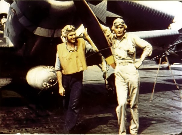 L’enseigne de vaisseau George Gay (à droite), seul survivant du VT-8, devant son avion un TBD Devastator, le 4 juin 1942 (Wikimedia Commons)