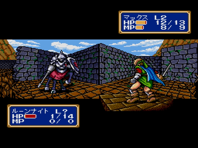 En parlant de danger, il s’avère sur SF n’est pas le plus difficile des jeux du genre. La difficulté y est progressive, et perdre un personnage n’est pas punitif, pas autant que dans un Fire Emblemi où il disparaîtra totalement, tout du moins. Ils pourront être ressuscités après la bataille, et si celle-ci semble perdue d’avance, Max pourra utiliser un sort pour repartir à la base. Le top du top ? L’argent, les points d’expérience et objets trouvés seront conservés ! En revanche, faire revenir un combattant à la vie coûtera une certaine somme, et l’argent peut vite venir à manquer. Dans le cas où c’est le Héros qui y passe, on perd automatiquement la bataille… et la moitié de son pécule ! Attention donc à ne pas trop prendre le challenge à la légère, surtout qu’il augmente progressivement, et certaines batailles sont plus ardues que d’autres. On remarquera, et regrettera même, qu’en se comportant toujours de la même façon dans un même niveau, les ennemis auront tendance à en faire de même, sans originalité. Cela peut ne pas être vrai à tous les coups, mais si l’on recommence une même bataille, on risque de le remarquer assez vite.