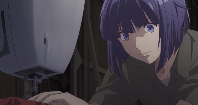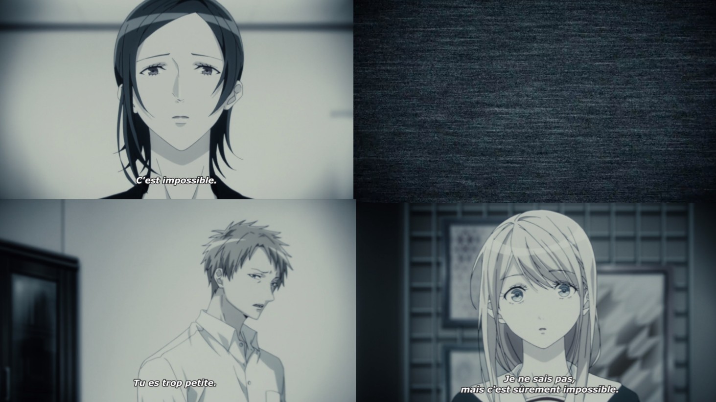 Ainsi, lors de sa première visite dans la salle du club de couture, après qu’Ikuto lui ait demandé son avis sur les chances qu’il a de réaliser son rêve, la remise en question de Chiyuki s’illustre par des approches distinctes. Dans le manga, INOYA privilégie une mise en avant du faciès de la jeune fille sur un fond blanc ou noir pour accentuer le regret et la peur qui se peint sur son visage. De son coté, pour donner de l’importance aux remords qu’éprouve la jeune fille, l’anime utilise une technique de « décoloration » durant les passages de flashback : un procédé qui consiste à atténuer les couleurs pour marquer la différence entre présent et passé, ainsi que pour renforcer la douleur et la tristesse ressentie. De plus un effet de « neige tv » est introduit pour entrecouper les flashbacks. Cette technique de décoloration nous rappelle d’ailleurs Kuzu no Honkai et Happy Sugar Life, séries sur lesquelles KANEKO et NAKAYAMA respectivement occupaient des postes de direction d’animation d’épisodes.