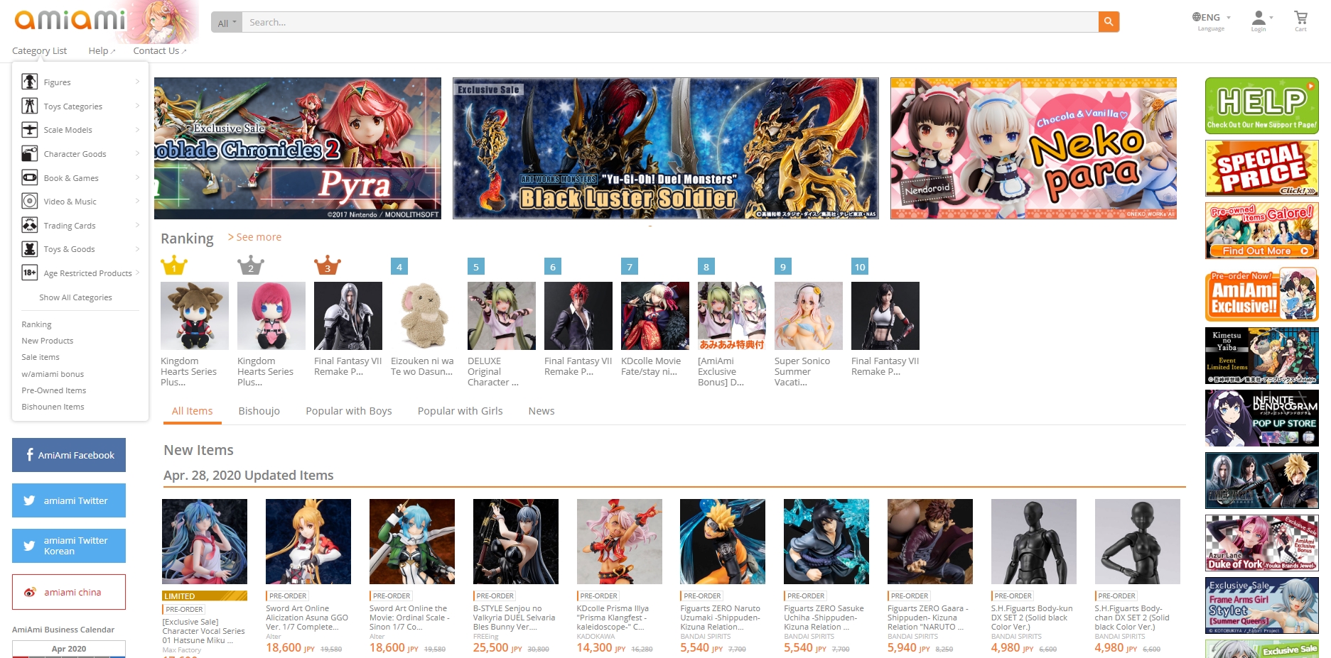 AmiAmi est une boutique du célèbre quartier électronique de Tokyo : Akihabara. C’est le seul site non traduit en français que l’on vous présente dans notre sélection de boutiques. Le site n’est disponible qu’en japonais et en anglais, mais le processus d’achat reste tout de même simple car identiques aux boutiques en ligne françaises par exemple.