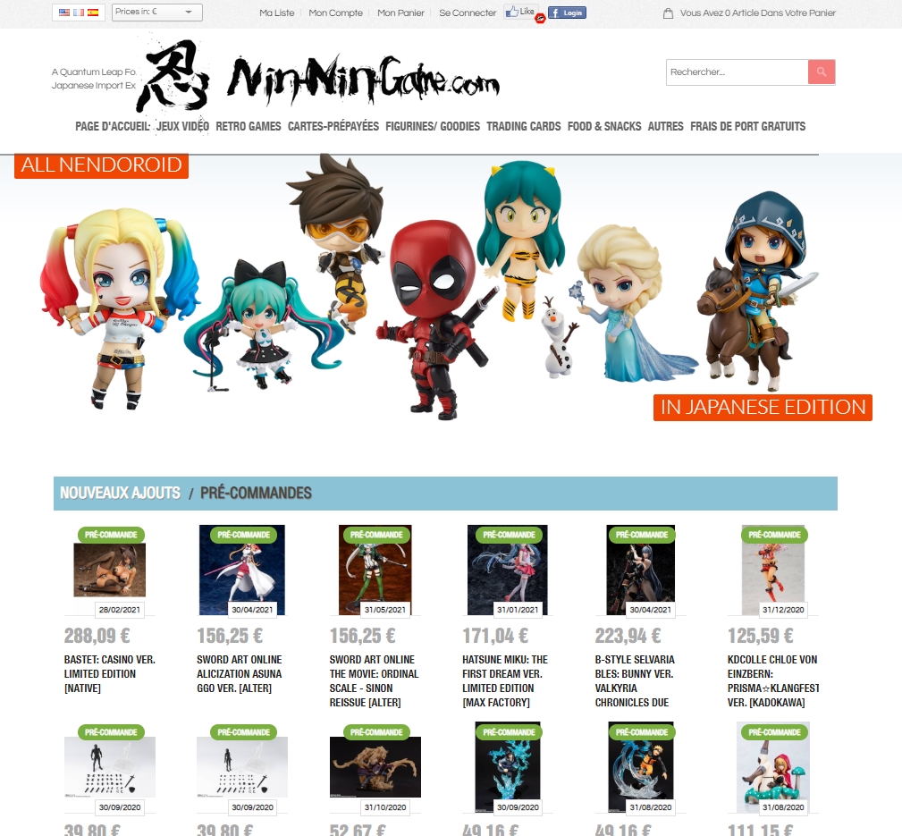Nin-Nin Game est un site d’import présent sur le marché depuis 2006 qui propose un très large choix de produits : de la figurine aux cartes à jouer en passant par les jeux vidéo, les DVDs/Blu-Ray et le snacking, on trouve un peu de tout sur Nin-Nin Game.