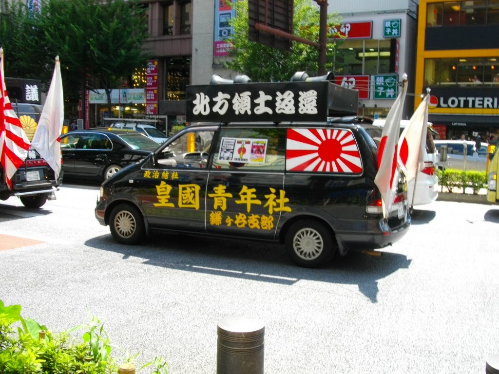 Ces groupes se font remarquer par leur apparition publique au volant de vans noirs appelés gaisensha dont les hauts parleurs scandent des slogans nationalistes. Ils brandissent des drapeaux de l’armée impériale (soleil rouge rayonnant sur fond blanc).