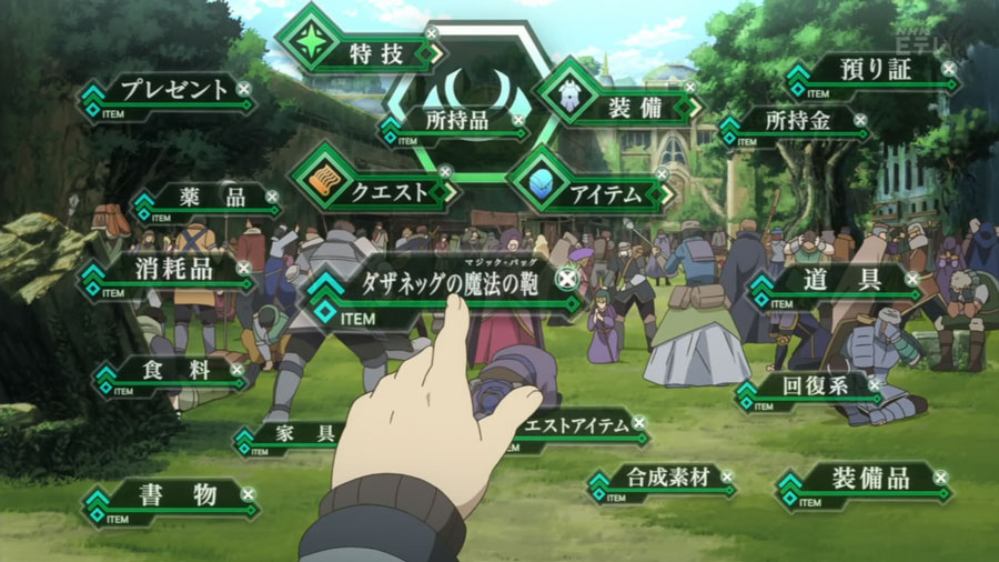 Comme pour n’importe quel récit, il est bien entendu primordial de créer de l’enjeu, de mettre en place une tension qui saura capter l’attention du spectateur. De ce point de vue, le VRMMO peut poser un problème capital puisque la mort n’y est en général pas définitive. Dans le cas où ce modèle est appliqué tel quel, la mort n’étant plus synonyme de fin, il est donc nécessaire de réussir à insuffler de l’enjeu autrement. Sauf exception où la mort virtuelle engendre une mort réelle, comme dans SAO, il faut donc trouver une autre méthode. La plupart de ceux qui ont réussi efficacement ont pour cela choisi de piéger les joueurs dans le jeu, comme c’est le cas avec d’excellentes séries comme Log Horizon, où l’histoire commence directement dans le jeu, sans aucun moyen d’en sortir. La résurrection systématique des aventuriers ajoute même au contraire au sentiment d’étouffement ressenti par les joueurs, puisque ce nouveau monde est sans échappatoire. Cette façon de faire offre un environnement privilégié pour observer les interactions entre les joueurs et la façon dont ils appréhendent l’univers virtuel, notamment leur rapport avec les PNJs. C’est d’ailleurs l’un des points sur lesquels Log Horizon se démarque de ses concurrents, puisqu’ils y sont considérés comme une force avec laquelle il sera nécessaire de nouer des liens diplomatiques favorables pour pouvoir avancer.