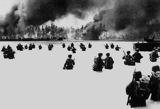 Contrairement aux précédents débarquements, les soldats se heurtent directement à des défenses organisées et à un feu nourri. Les Japonais ont ainsi le temps de reprendre leurs esprits et d’organiser la défense de l’île en ajustant leurs salves de mortiers et leurs rafales de mitrailleuses. Des embarcations sont touchées. La barrière de corail atteinte et la marée trop basse, les hommes doivent se jeter à l’eau : à découvert, avec de l’eau jusqu’à la taille, il reste aux Américains 500 à 600 mètres à parcourir ! Des centaines de cadavres sont ballottés par les flots. Quelques chars réussissent à débarquer et peu à peu, les bataillons qui paient un lourd tribu, gagnent des mètres à la grenade et aux explosifs. En fin de journée, des têtes de pont de 150 mètres de profondeur sont conquises. Au matin du 21 novembre, deux bataillons de réserve arrivent en renfort. Les chars et l’artillerie appuient la progression des Marines. Dans la nuit du 22 au 23, 500 Japonais refoulés dans la partie orientale de l’île lancent une importante contre-attaque pour tenter de repousser les Américains à la mer. La charge nipponne désespérée à la baïonnette est arrêtée sans difficulté à la grenade et à la mitrailleuse. Dès le lendemain, le 23, les dernières forces japonaises sont anéanties. De la garnison, seuls un officier et 16 soldats ont été faits prisonniers. Du côté américain, le bilan de la bataille de Tarawa est terrible : un millier de morts et plus de 2 000 blessés.