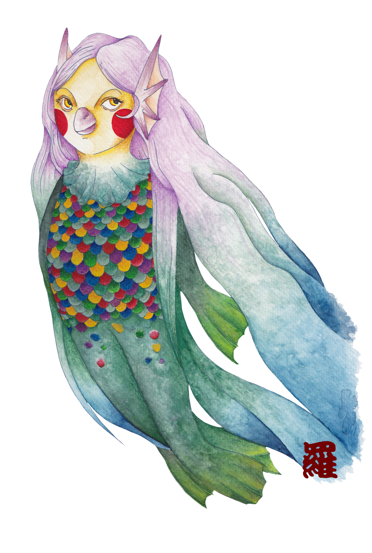 A gauche : « Ma version de l’Amabie se base sur cette description sommaire d’une «créature anthropomorphe à trois queues». J’ai voulu lui donner un air à la fois doux et légèrement menaçant : elle peut annoncer une épidémie comme une bonne récolte ! Ensuite, j’ai choisi de la faire avec des tons de vert et de bleu, puisqu’elle est censée sortir de l’eau. Le reste est venu naturellement : le rose pour alléger et la palette de yuzen pour la rendre plus colorée. Les techniques utilisées sont : aquarelle, encre, pastels, crayons de couleur et Procreate, sur un papier Fabriano 25% coton.«