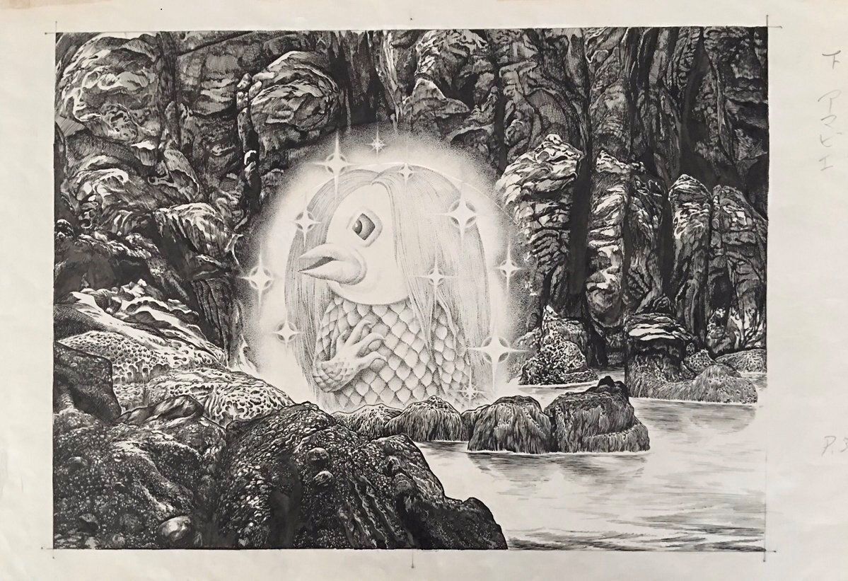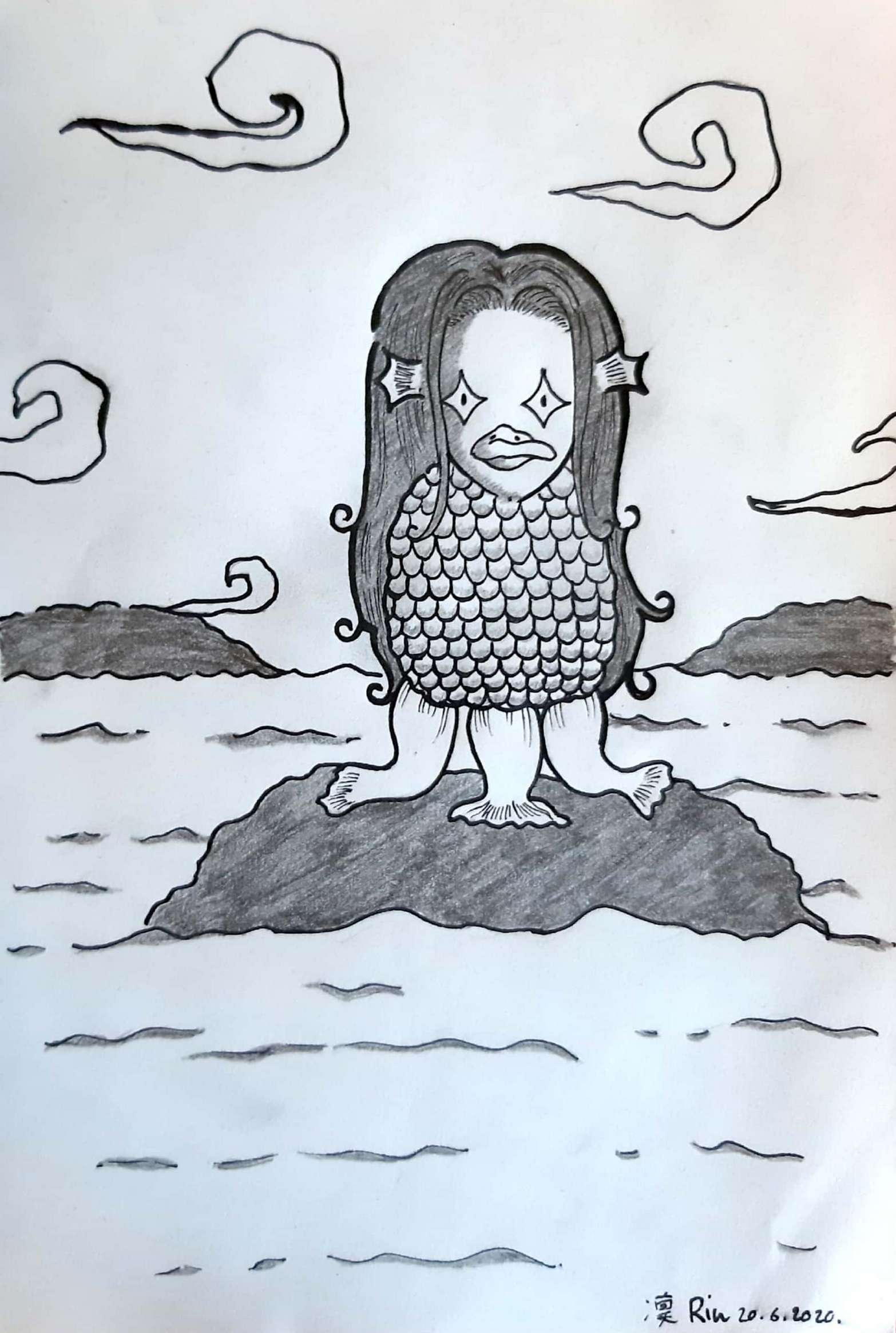 A droite : « Les yôkai ont souvent une représentation effrayante ou grotesque, et j’ai voulu donner à ma version un style plus mignon et attrayant. Étant une créature aquatique, j’ai choisi de la représenter au milieu de l’eau. J’ai fait le choix de laisser mon dessin en noir et blanc afin de laisser libre cours à l’imagination et l’interprétation de ceux qui l’observeront.«