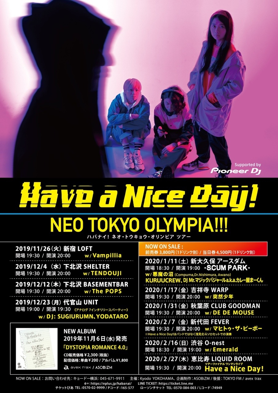 Après avoir multiplié les concerts et les tournées à l’échelle nationale, Have A Nice Day! a décidé de se recentrer à nouveau sur Tokyo en accompagnant DYSTOPIA ROMANCE 4.0 d’une tournée intégralement tokyoïte entre novembre 2019 et février 2020. Intitulée NEO TOKYO OLYMPIA!!!, cette série de dix concerts a eu lieu dans dix salles différentes, réparties dans différents arrondissements de la capitale. De plus, Have A Nice Day! s’est affiché comme l’un des instigateurs de la vie musicale locale en partageant l’affiche des concerts avec d’autres groupes importants de la scène contemporaine indépendante japonaise tels que le groupe de métal Vampillia, les groupes de rock TENDOUJI et Totsuzen Shōnen, ou le groupe de progressive hardcore KURUUCREW.