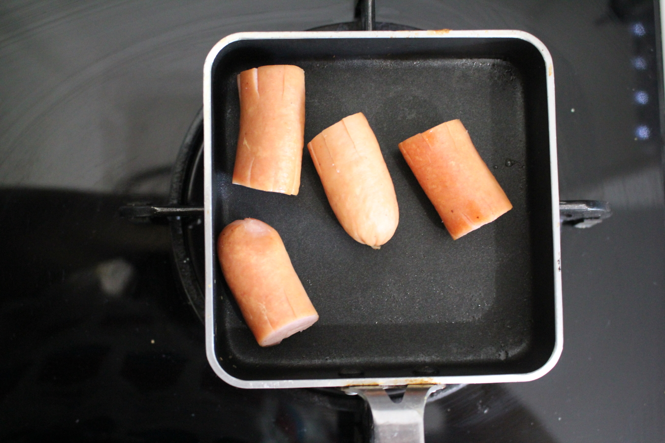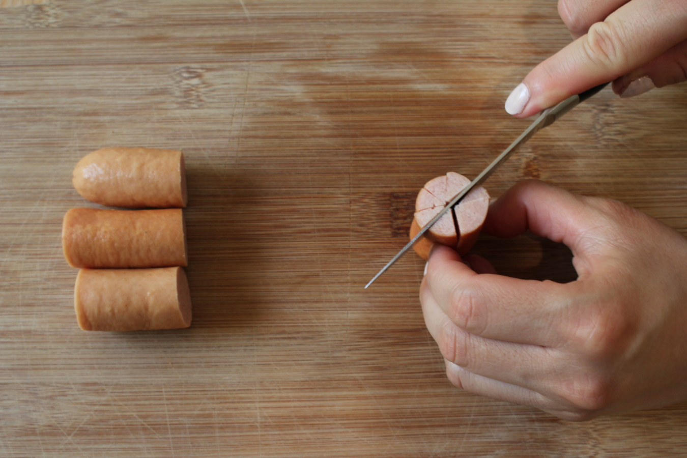 - Coupez la saucisse en 4 tronçons égaux. Pour les morceaux avec un bout arrondi, seule la face tranchée est incisée pour former un poulpe (tako). Pour les morceaux coupés au milieu, l’astuce est de faire les incisions des deux cotés pour former de petits crabes. Faites 4 incisions (pour former 8 tentacules donc) sur 1,5 cm de profondeur.