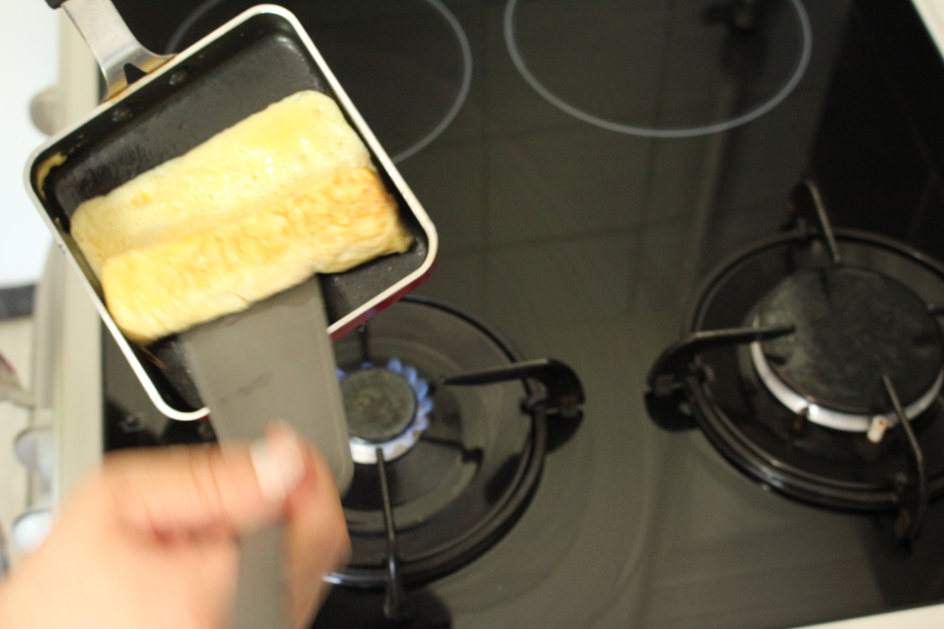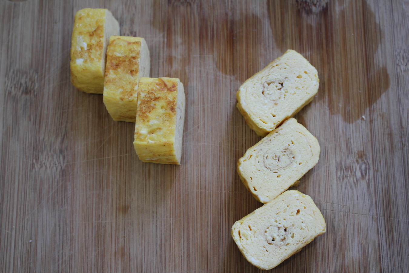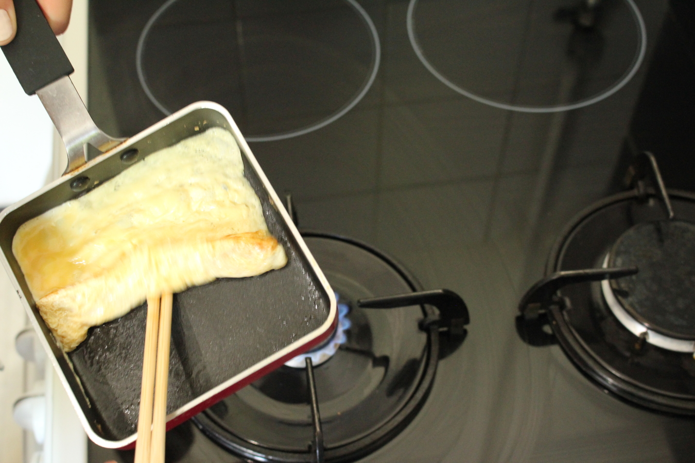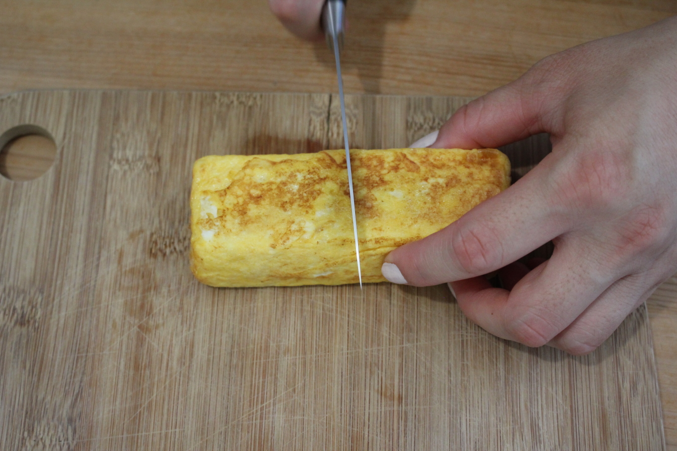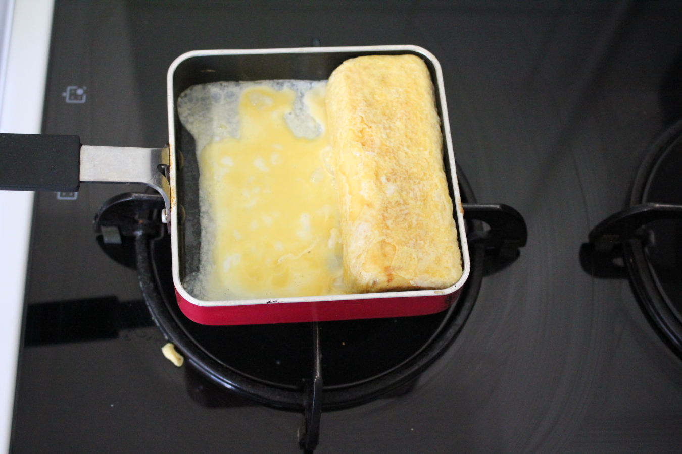 - Pour le tamagoyaki : versez une petite quantité de la préparation dans la poêle huilée. Faites une première couche fine. Attendez qu’elle soit suffisamment cuite pour être manipulée, et roulez-là sur elle-même à l’aide d’une spatule ou de baguettes. La première couche est la plus fragile et la plus difficile à manipuler, mais ne vous inquiétez pas si celle-ci n’est pas parfaite. Placez ensuite le boudin obtenu contre un bord de la poêle, et versez de la préparation dans la zone libre. Tant que la nouvelle couche est encore « humide », roulez de nouveau l’omelette : les différentes couches vont se souder pour former un tout. Plaquez le boudin pour lui faire prendre une forme bien nette et renouvelez l’opération jusqu’à ne plus avoir de préparation.