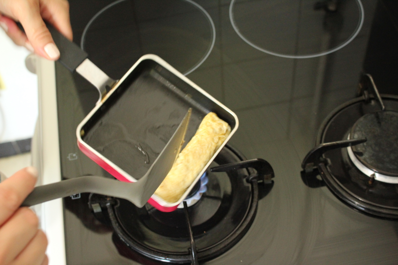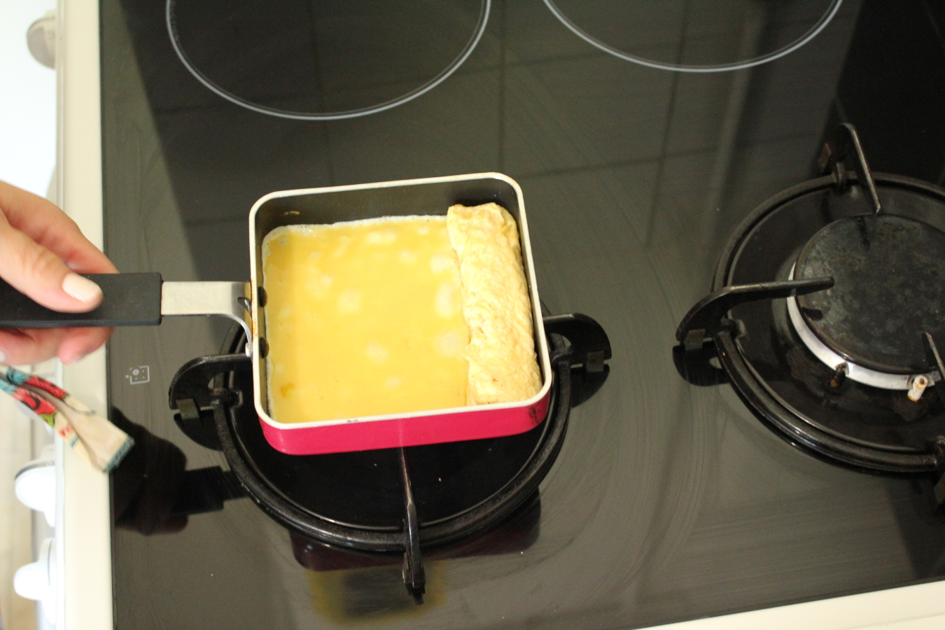 – une poêle pour le tamagoyaki. Idéalement, il existe des poêles à tamagoyaki dans les épiceries asiatiques, de forme rectangulaire, mais il est possible de faire sans. Soit avec une petite poêle carrée comme nous avons utilisé, soit une poêle ronde classique, mais il faudra alors replier les bords latéraux avant de rouler (comme pour un nem ou un rouleau de printemps).