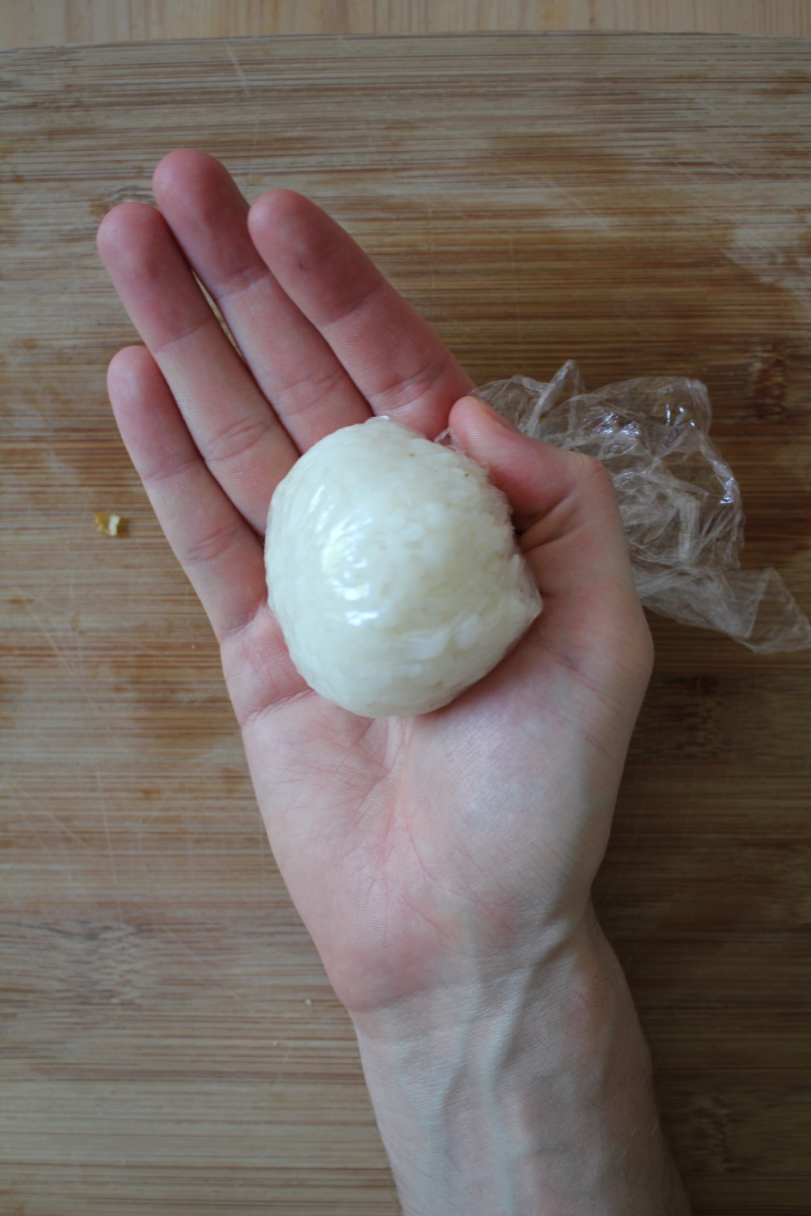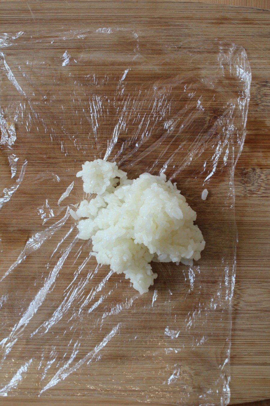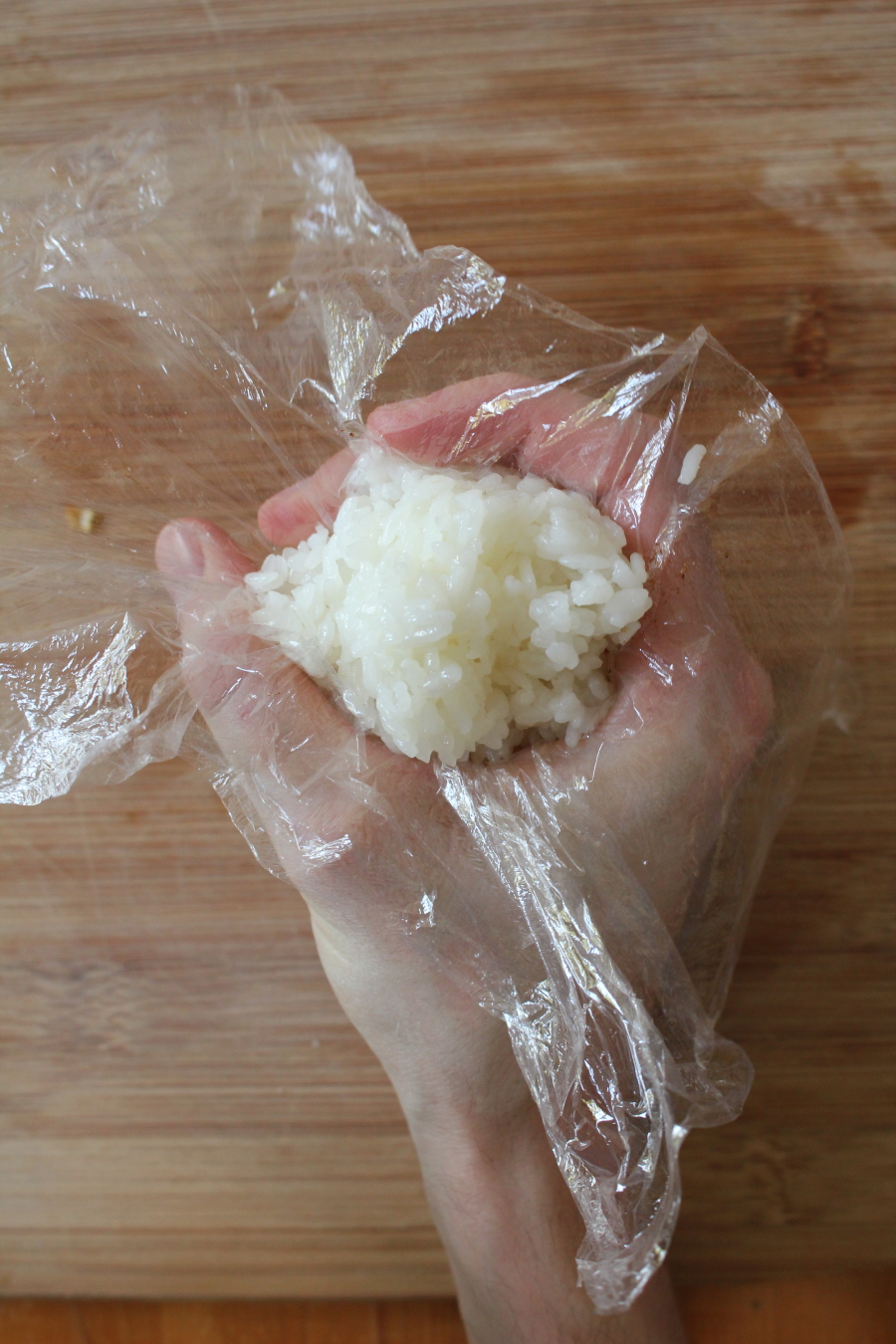 - Pour les temari sushi : prélevez une partie du riz, de quoi tenir dans une main refermée, et disposez-le sur un morceau de film étirable. Formez une boule et terminez de la serrer en formant un pochon comme sur notre photo. Mettez la boule de riz de coté.