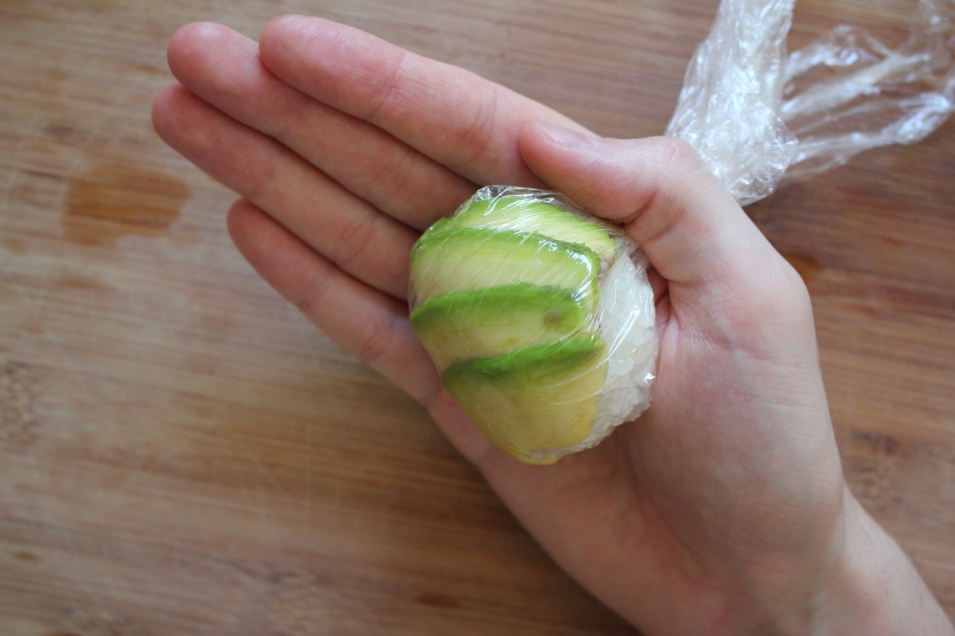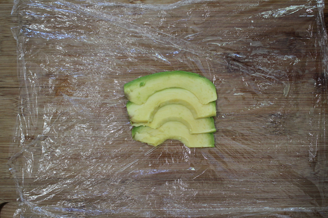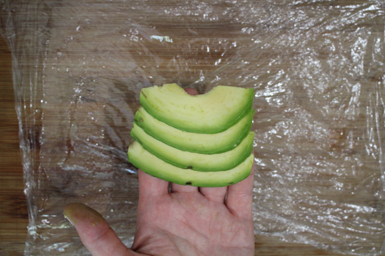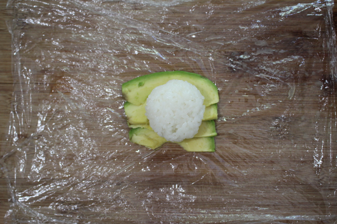 - Coupez des tranches d’avocat et disposez-les étalées les unes sur les autres de manière à ce qu’elles recouvrent la moitié d’une boulette de riz. Posez les tranches d’avocat sur le film étirable. Mettez la boule de riz par dessus et refaites la manipulation précédente pour plaquer l’avocat contre le riz. Arrosez légèrement de jus de citron si vous ne comptez pas manger tout de suite pour éviter l’oxydation de l’avocat (un avocat noircit très vite sinon).
