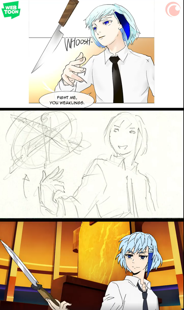 L’anime est donc contraint de faire des choix de mise en scène. Par exemple pendant la scène d’introduction avec Yuri, le manhwa explique d’emblée une partie des règles de ce monde alors que l’anime laisse Bam et le spectateur complètement ignorants. Mais de manière générale, l’adaptation est très bien menée et les révélations sont simplement « moins évidentes » : le spectateur est plus actif et doit parfois faire les liens par lui-même. Ainsi, même si aucune révélation majeure n’est absente, il vous faudra tout de même lire le webtoon depuis le début si vous voulez toutes les clefs de compréhension.