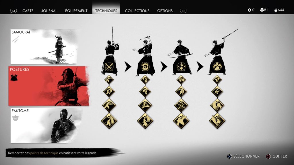 Outre les compétences de samouraïs et son habilité à l’arc et au katana, Jin dispose de nombreuses compétences et armes propres au Fantôme (mention spéciale pour les kunai bien pratiques pour dégrossir les rangs ennemis) pour éliminer furtivement ses proies mais aussi se sortir de situations périlleuses : encerclé par un groupe trop nombreux, une bombe fumigène et Jin peut s’échapper grâce à la fumée. Avec ses techniques de ninja, que cela soit en samouraï ou en Fantôme, Jin est paré à toutes les situations. La maîtrise de ces deux modes de jeu est bien expliqué et intégré dans l’histoire principale avec son mentor, Yuna la voleuse. L’infiltration ne dépaysera pas car elle reprend les bonnes recettes qui fonctionnent. Grâce au pavé tactile, Jin entre en écoute furtive qui permet au joueur d’adopter une vue en noir et blanc et de repérer plus facilement les ennemis qui apparaissent en rouge. A pas de loup, Jin peut s’approcher très discrètement derrière la cible et la tuer avec la touche ◻️. Pour se cacher, le Fantôme peut attendre derrière des tonneaux ou bien se baisser dans des herbes hautes.