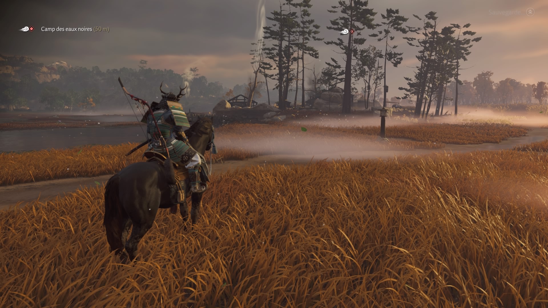 Au gré du vent et de l’exploration de l’île, le joueur peut s’accorder des petites parenthèses aux combats et aux chevauchées sur son fidèle cheval : Jin peut se reposer dans les sources chaudes et méditer sur deux sujets proposés à chaque fois… mais aussi écrire un haïku en observant la nature et des paysages remarquables. Éliminer les Mongols des camps et des forts en rouge sur la carte permet de révéler ces endroits à découvrir qui apparaissent avec des ?.