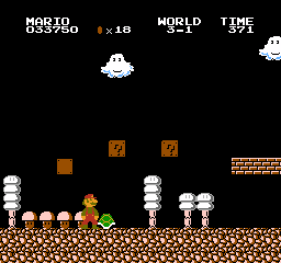 Super Mario Bros. est, comme tout le monde le sait sans doute, un jeu de plate-forme en 2D où l’on va de gauche à droite, d’un point de départ jusqu’à la sortie du niveau. Mario peut donc marcher, courir en maintenant la touche B, sauter à plusieurs niveaux selon la pression mise sur le bouton, se baisser aussi. Le décor défile sans qu’il soit possible de revenir en arrière, et il y a un temps limité pour finir un niveau : si Mario le dépasse ou qu’il perd trois vies, c’est le Game Over. On peut toutefois en regagner en attrapant cent pièces disséminées tout au long des niveaux. Le jeu dispose d’autres mécaniques en plus de cela, telle que celle des champignons, qui font grandir le personnage, lui permettant d’encaisser un coup. Dans le cas où il est touché sous cette forme, il redeviendra petit et vulnérable. Mais si on a la chance d’attraper une fleur de feu, Mario pourra tirer et atteindre les ennemis à distance avec. Et en de plus rares occasions, on pourra glaner une étoile qui le rendra invincible pour un temps limité. Mais cela n’empêchera pas de perdre une vie s’il tombe dans un gouffre !
