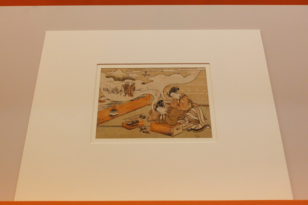 Hokusai, Hasui et Hiroshige, les grands noms de l’estampe japonaise, sont bien évidemment au cœur de « Fuji, pays de neige ». L’exposition temporaire présente également aux visiteurs des œuvres de Masanobu, Haronobu, Koryusai, Kiyonaga, Utamaro, Yashima, Hokkei, Toyohiro, Keisai, Hokuju et Kuniyoshi. De quoi découvrir ou redécouvrir des artistes parfois dans l’ombre des plus célèbres, pour notre plus grand plaisir. D’un point de vue personnel, Traversée de la rivière Rokugo près du relais de Kawasaki sur le Tokaido sort du lot et témoigne de la grande maîtrise de la colorimétrie de Shotei Hokuju, l’un des meilleurs élèves de Hokusai. Une courtisane de la maison Asahimaruya et Les premiers jours de printemps, deux œuvres de Isoda Koryusai qui représentent des femmes rêvant et admirant le mont Fuji sont une invitation au voyage onirique dont le visiteur peut s’identifier sans peine. Pour finir, La neige à Kaga de Utagawa Kuniyoshi impressionne par ses nuances de bleu et la profondeur de ses reflets.
