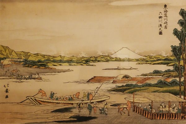 A gauche, 4 vues du Mont Fuji par Hokusai. A droite, la traversée de la rivière Rokugo près du relais de Kawasaki sur le Tokaido de Shotei Hokuju (Crédits : Rokusan pour Journal du Japon)
