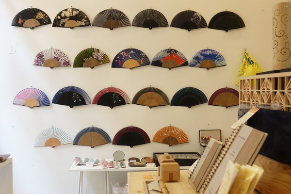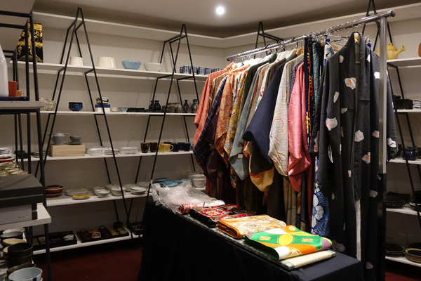 A gauche, rayon de la librairie Junku. Au centre, focus sur les éventails de Discover Japan. A droite, de la vaisselle et des yukata de Discover Japan. (Crédits : Rokusan pour Journal du Japon)