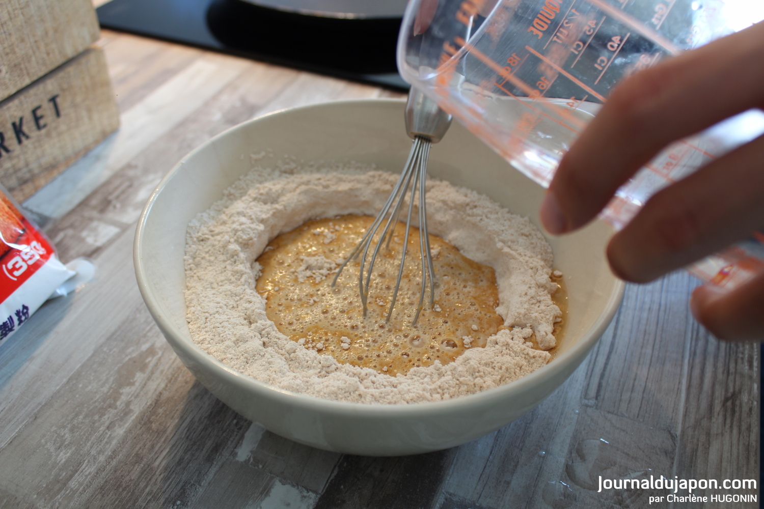 - Versez 200g du mélange Chinbin mix dans un saladier. Ajoutez-y 200 à 300ml d’eau et remuez jusqu’à obtenir une pâte lisse sans grumeaux.