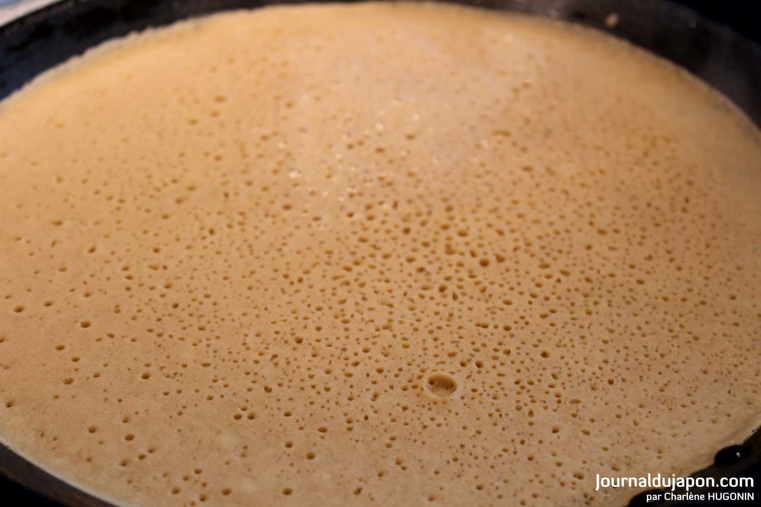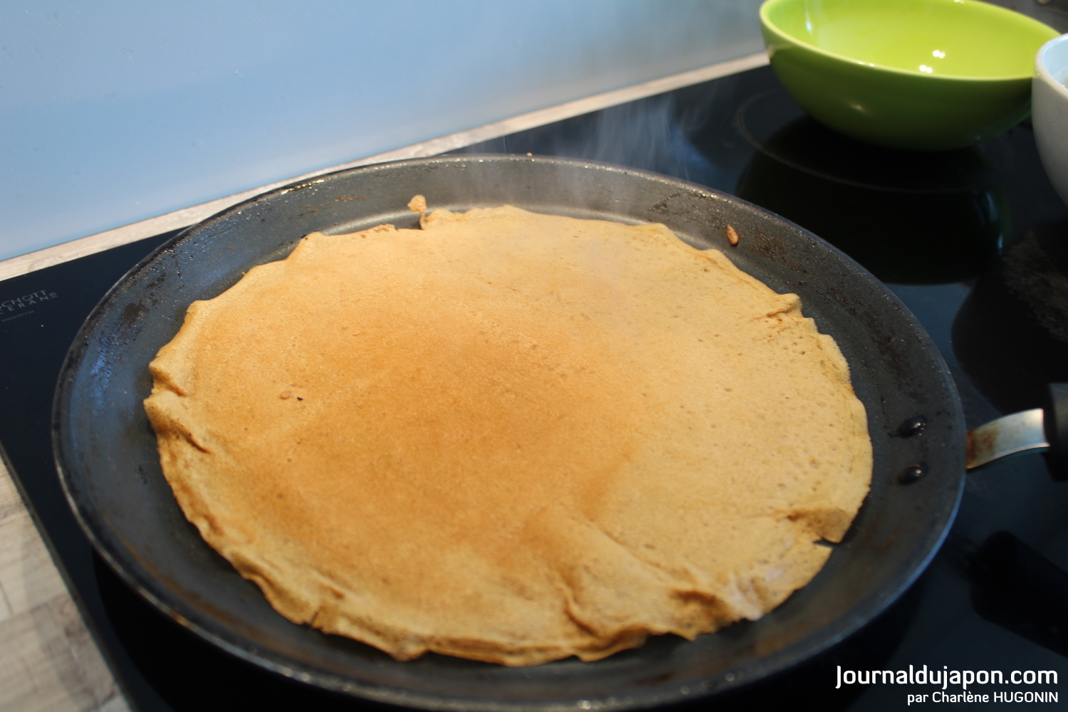 - Préparez votre poêle (ou crêpière) en la huilant et en l’amenant à feu moyen. Une fois la poêle chaude, versez la pâte pour que toute la poêle soit recouverte mais que cela reste fin. Quand vous commencez à apercevoir de petites bulles à la surface, retournez la crêpe et laisser cuire l’autre côté.
