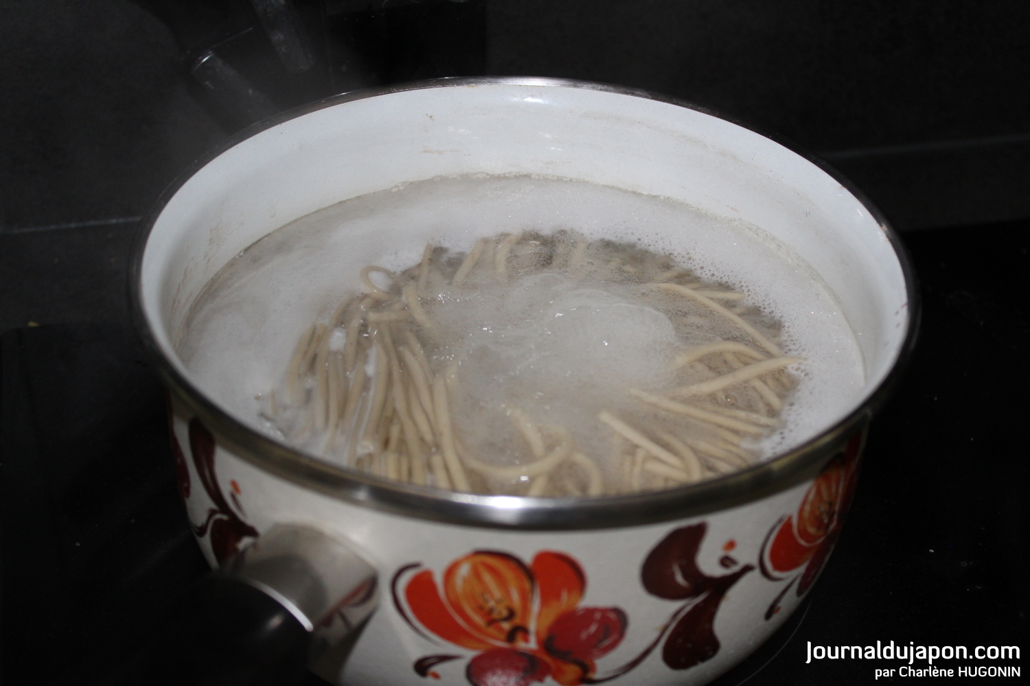- Mettre les nouilles dans un litre d’eau bouillante pendant 10 minutes. Les égoutter et les rincer à l’eau froide, puis les réserver.
