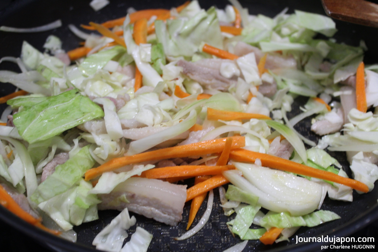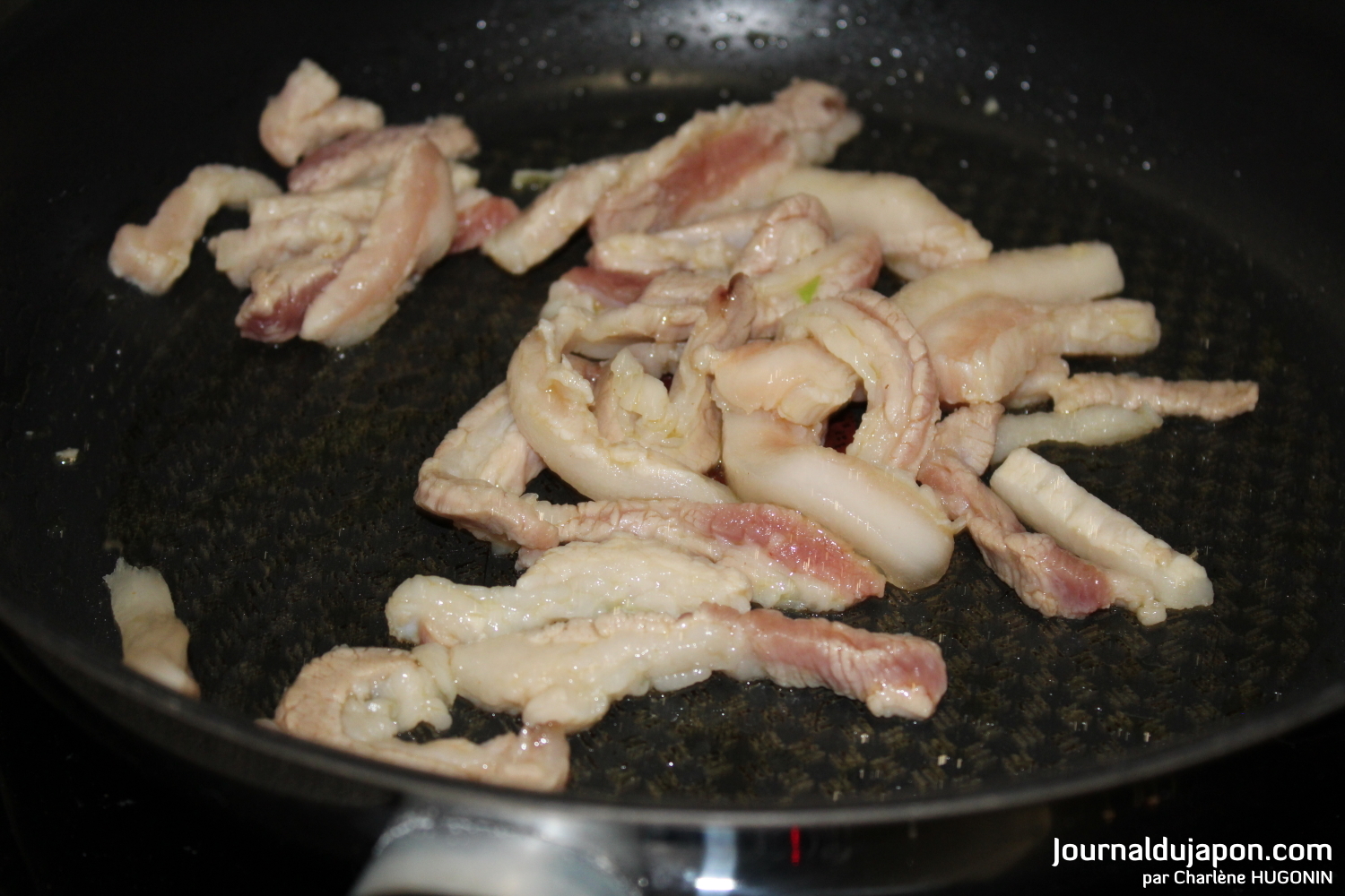 - Dans une poêle ou un wok, faites revenir un peu d’huile à feu moyen. Ajoutez le porc coupé en fines lamelles et cuisez-le jusqu’à ce qu’il ne soit plus rose. Ajoutez ensuite les oignons et la carotte, et faite cuire le tout pendant environ 2 minutes. Ensuite, ajoutez le chou ou les épinards (suivant ce que vous avez choisi) et faire cuire le tout jusqu’à ce que ces derniers commencent à ramollir.