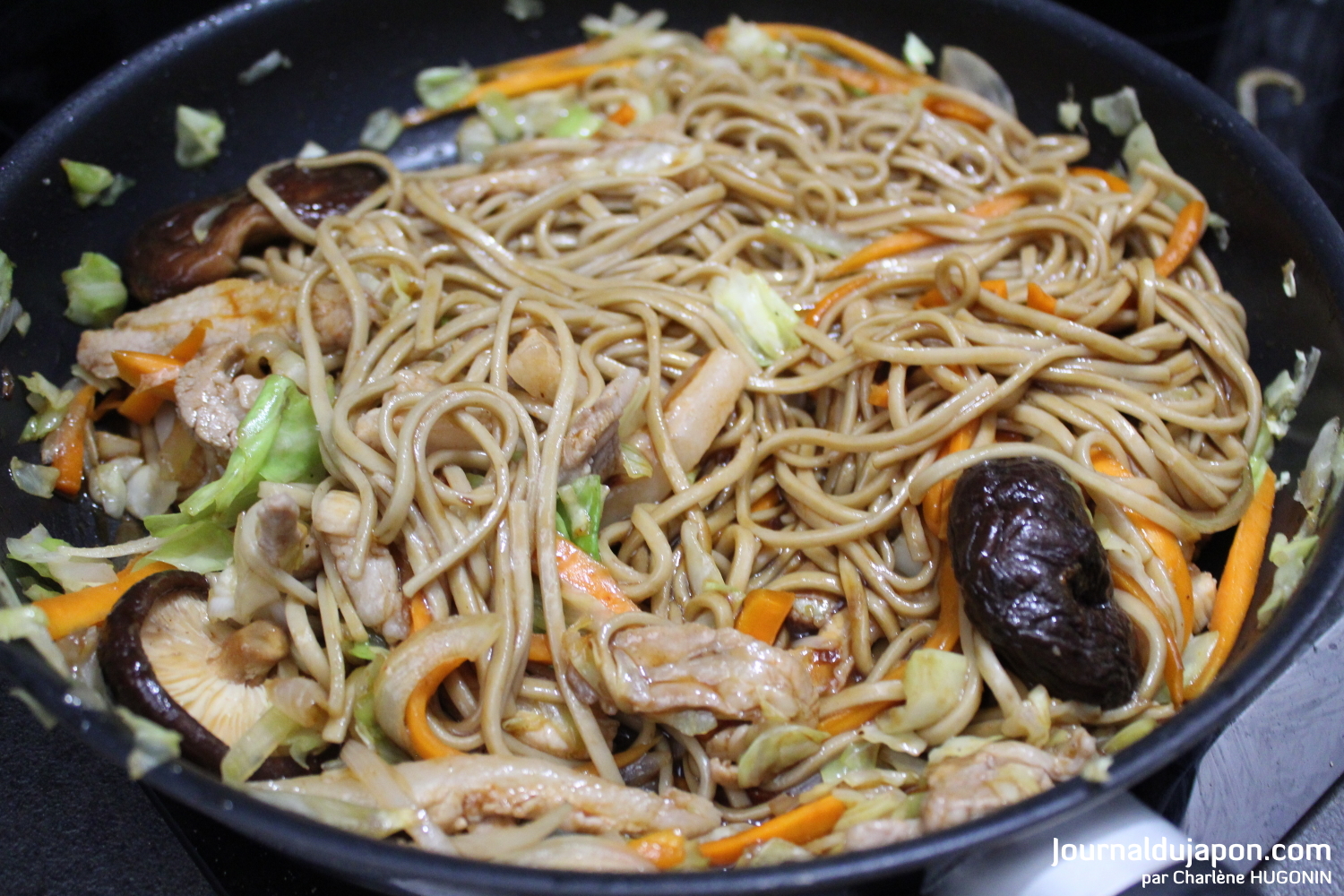- Terminez la recette en ajoutant dans la poêle les nouilles préalablement cuite, et la sauce préparée au tout début de la recette. Bien mélanger le tout ensemble pendant une à deux minutes.