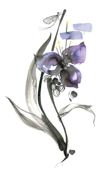Quant aux peintures des fleurs, on retrouve les petits détails et la structure des plantes faits de traits noirs très fins, ensuite enluminés de belles touches de couleurs pour donner à la fleur finesse et beauté. Des petits détails accompagnent ces plantes : une échelle sur un pot, un insecte qui s’envole, un oiseau qui regarde, mille petits grains qui semblent vivre dans la plante, une souris et quelques feuilles de papier, une chaise posée sur un rocher, une toile d’araignée bien installée et tant d’autres petits détails merveilleux qu’il faut prendre le temps de débusquer.