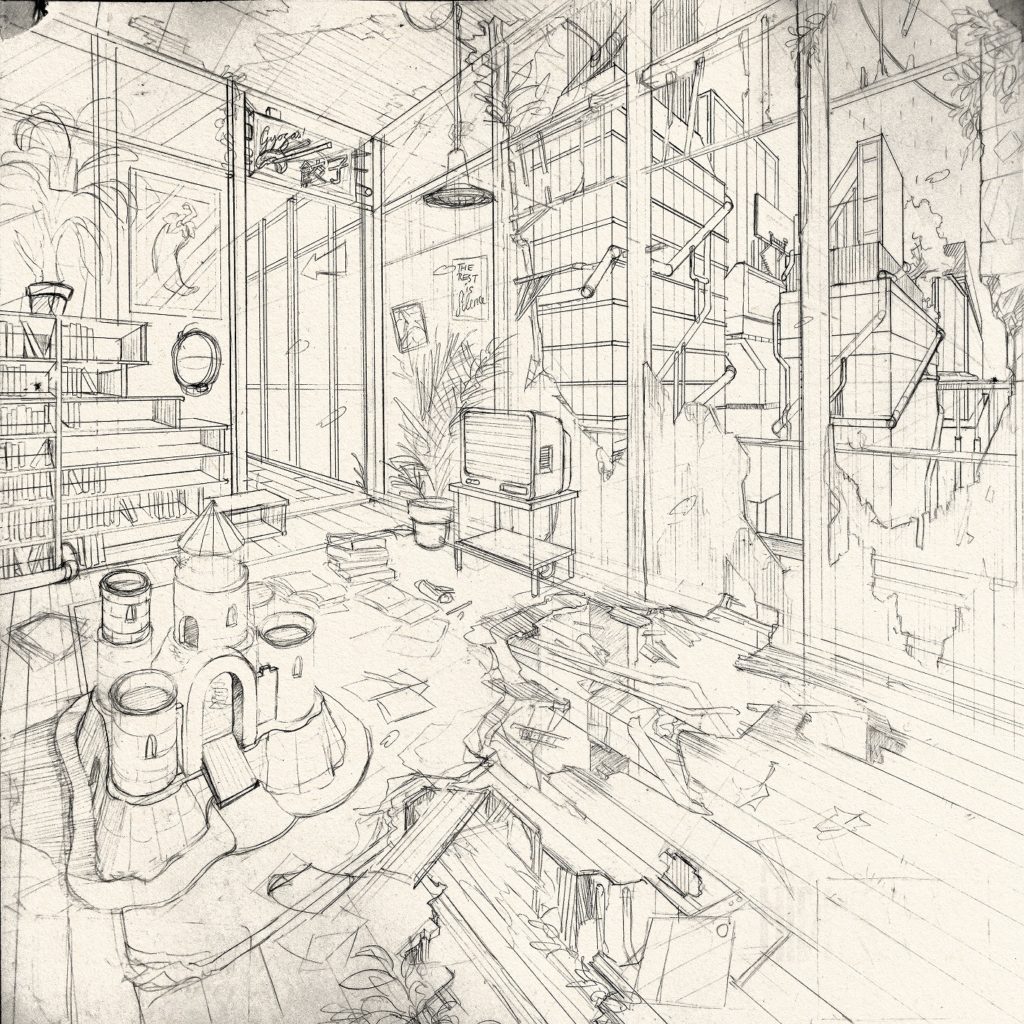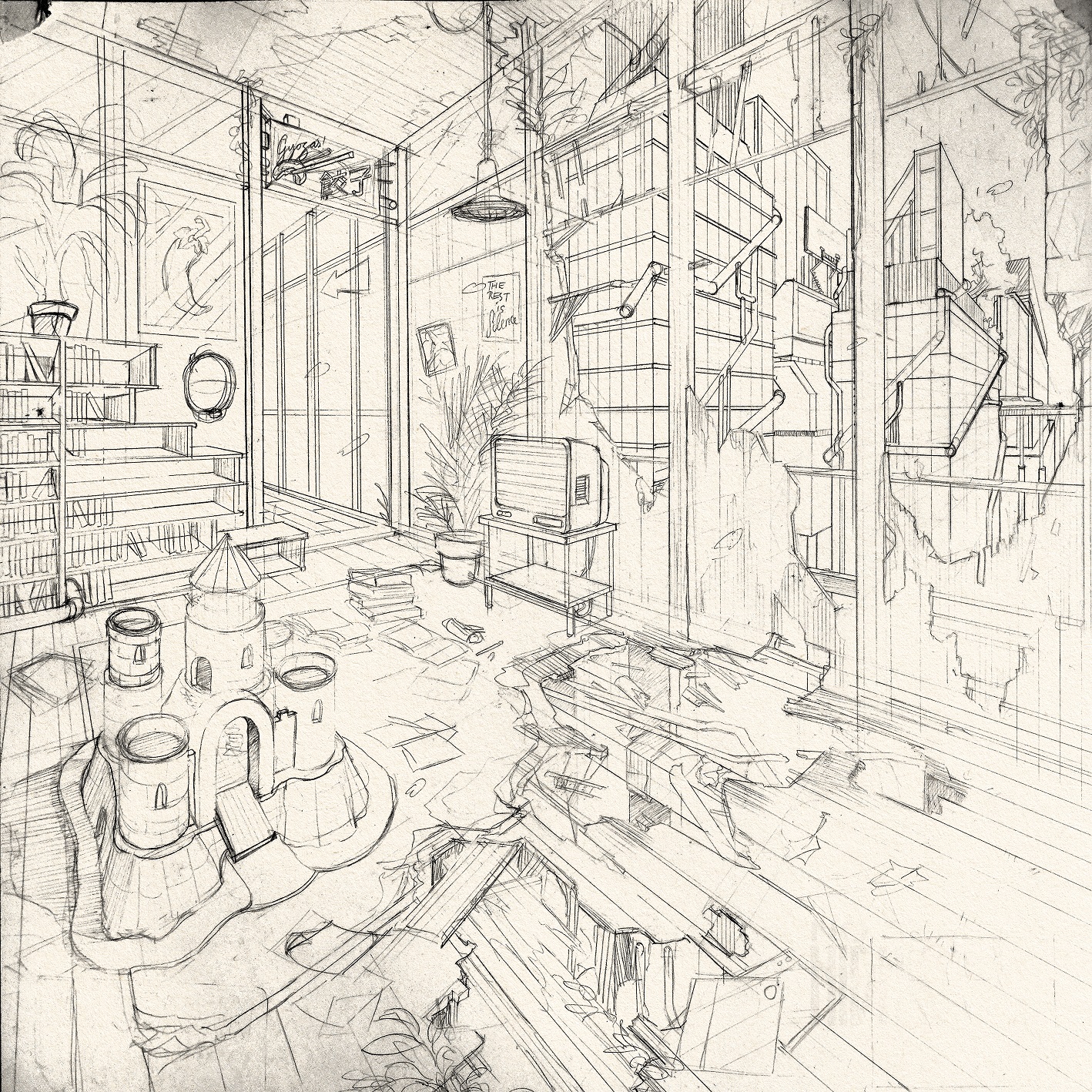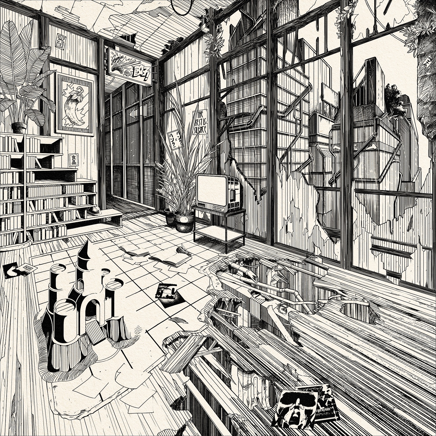 Je peux vous présenter la pochette de l’album Highwires pour le groupe No Season que j’ai réalisé un peu plus tôt l’année dernière. Un groupe de musique de Metz m’a contacté afin que je réalise la pochette de leur premier album physique. La majeure partie de l’esthétique du groupe est basée sur le Japon et l’idée était de faire un décor urbain aux influences Neo-Tokyo de Otomo avec le traité graphique réaliste de Inio Asano (Oyasumi Punpun). L’album était chargé de nostalgie. Cela m’a donné l’idée de dessiner une chambre délabrée dans laquelle je pouvais intégrer des éléments liés aux textes des morceaux ainsi que de vraies références liées aux membres du groupe. L’aspect détérioré de la chambre permettait d’exprimer le temps qui passe et le changement. Le dos de l’album correspond à la tracklist présentée sous forme de VHS qui font référence à la bibliothèque présente sur la pochette. Comme si en regardant l’image de plus près, on en découvrait davantage sur l’album.