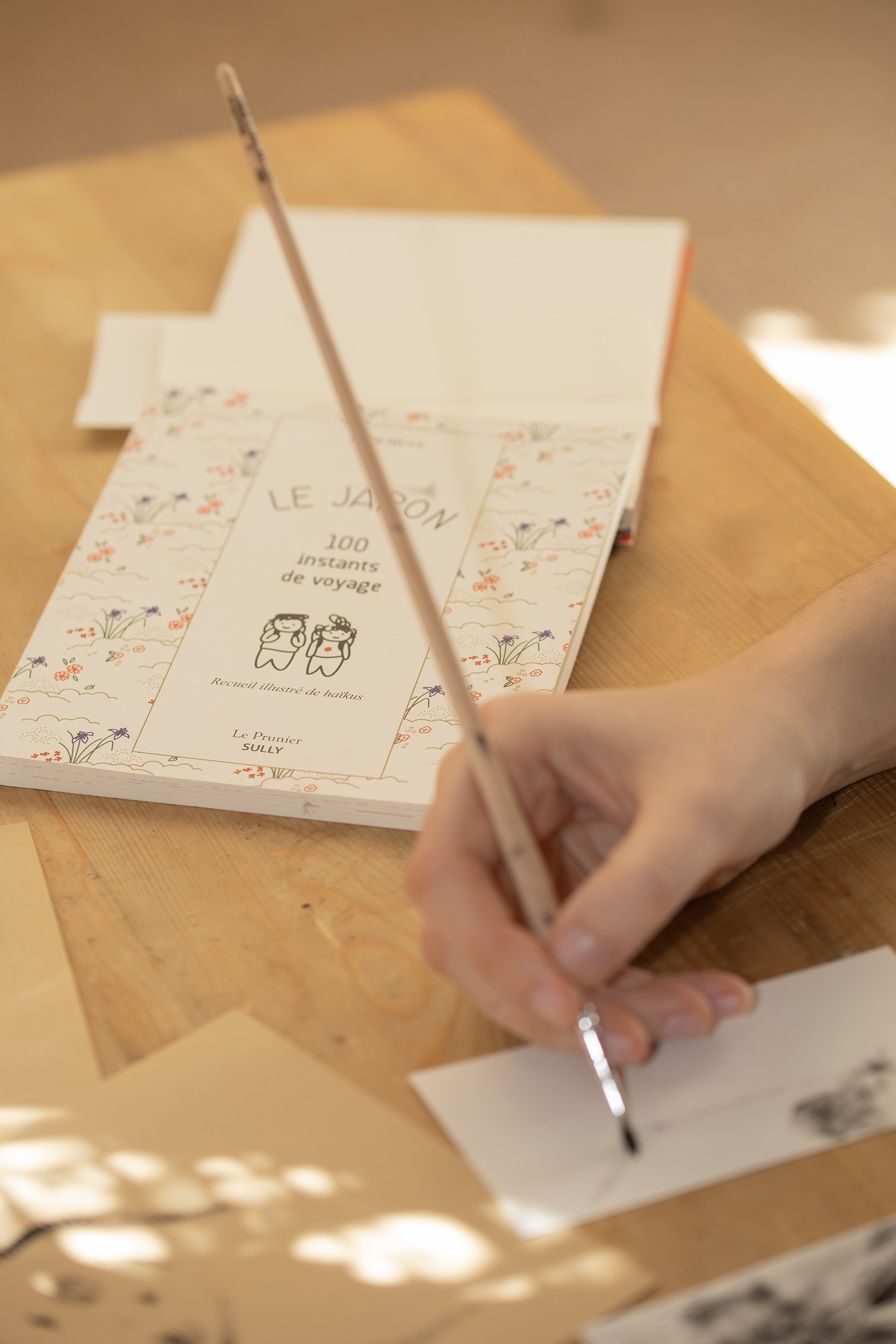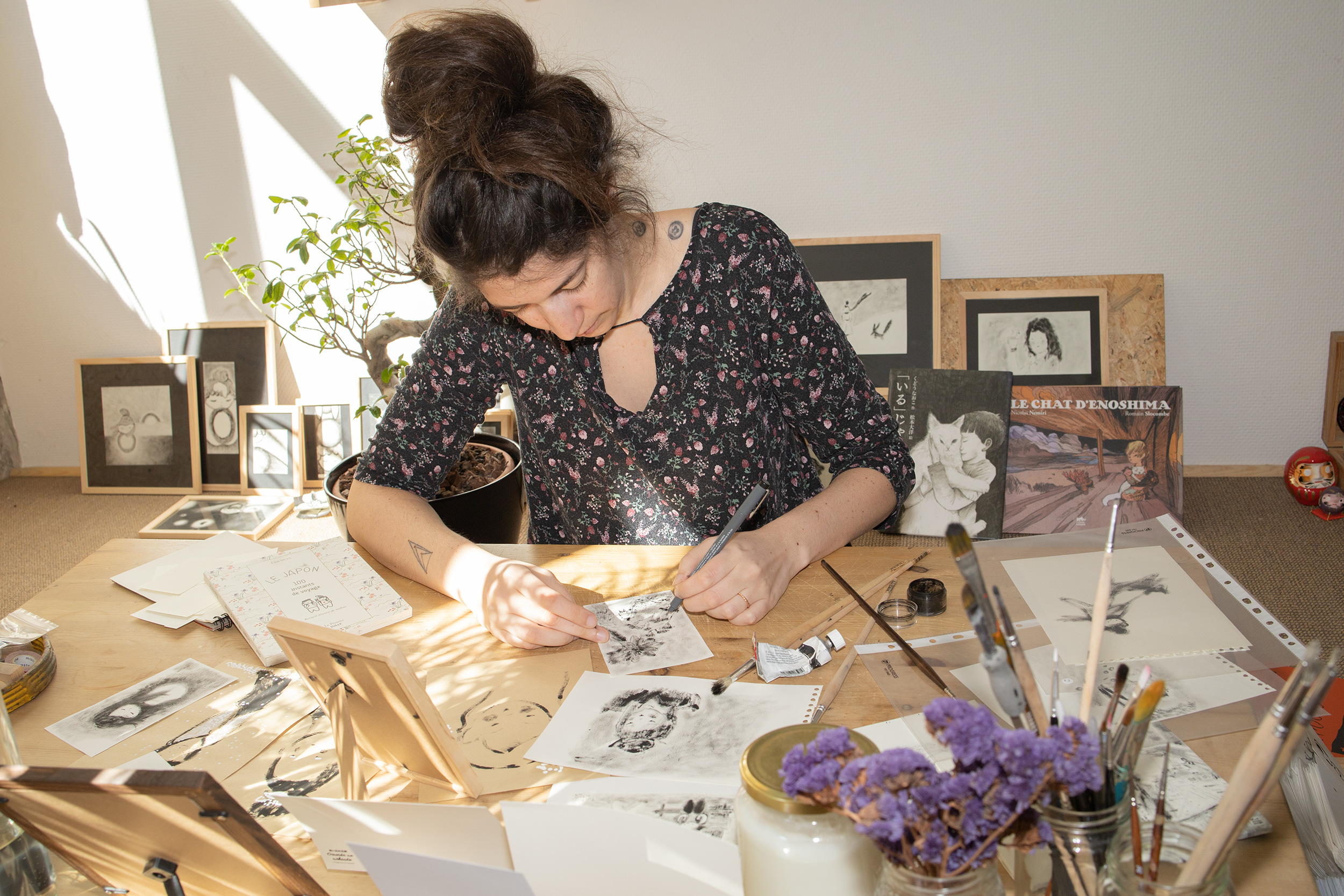 Durant ce séjour, je dessinais chaque jour, pour nous. Et puis, ne parlant pas le japonais, j’ai utilisé les dessins pour communiquer. Ils se sont accumulés. J’ai découvert le pouvoir des haïkus* avec mon livre de chevet, « Oreiller d’herbes » de Natsume SÔSEKI. Sur place, j’en ai peu écrit. Les mots sont venus après. Une sorte de mélancolie pour capturer chaque instant de la vie, c’est un moteur dans mon travail, une part de moi que j’ai appris à valoriser.