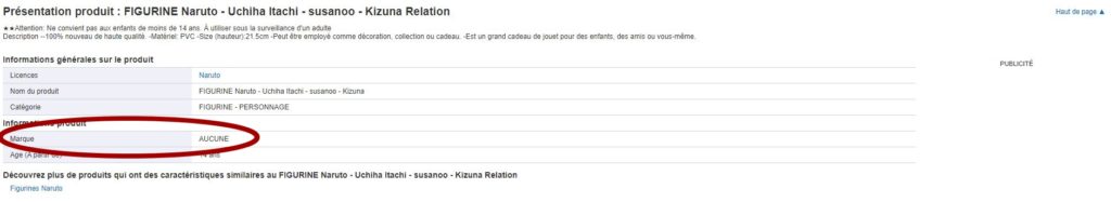 Fiche produit sur Cdiscount ne précisant aucune marque pour cette contrefaçon d’Itachi. Le logo de Naruto essaye d’induire en erreur le client.