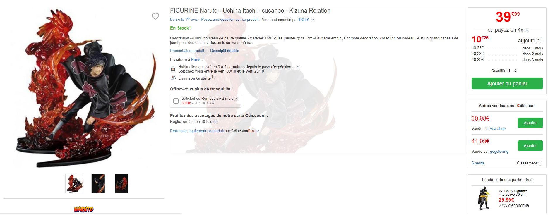 Fiche produit sur Cdiscount ne précisant aucune marque pour cette contrefaçon d’Itachi. Le logo de Naruto essaye d’induire en erreur le client.