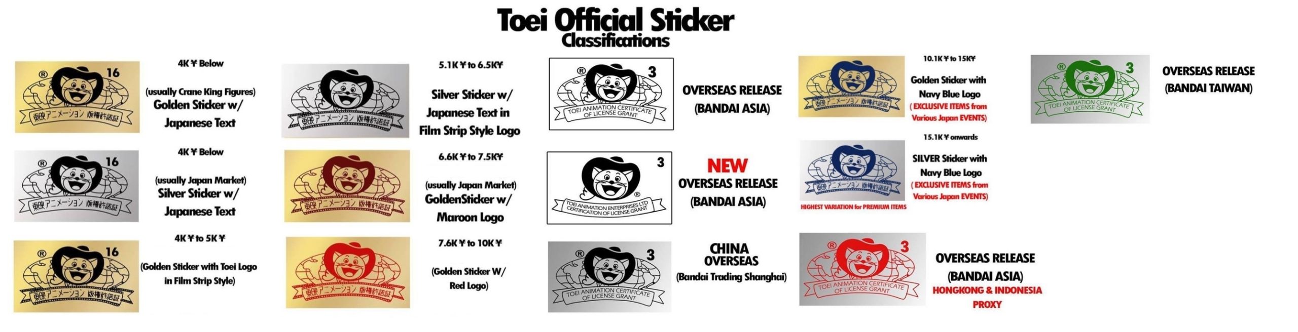 Pour autant, faisons un petit tour non exhaustifs des différentes pastilles : on peut citer les pastilles de la Toei Animation et les pastilles d’importation comme par exemple le sticker de Abysse Corp qui est le plus grand grossiste français. Les pastilles de la Toei Animation sont nombreuses : elles sont soumises à des classifications qui vont dépendre du prix et de la provenance.