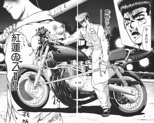 On peut apercevoir sur les tokko-fuku de nombreuses inscriptions en kanji, qui mentionnent le nom du clan et du porteur de la veste, sa position dans le gang, ainsi que des slogans provocateurs anti-police ou anti-société. On trouve également des messages représentatifs de la mentalité de ces bikers, telle que « je traverse la vie à toute allure, sans regrets ». L’uniforme va souvent de pair avec un bandeau, le hachimaki, un masque chirurgical qui vous est désormais familier (!). Et parfois, le bosozoku porte de petites lunettes rondes. Quant a la coiffure, il s’agit bien souvent d’une banane de rocker, comme celle du jeune Onizuka de Shonan Junai Gumi :
