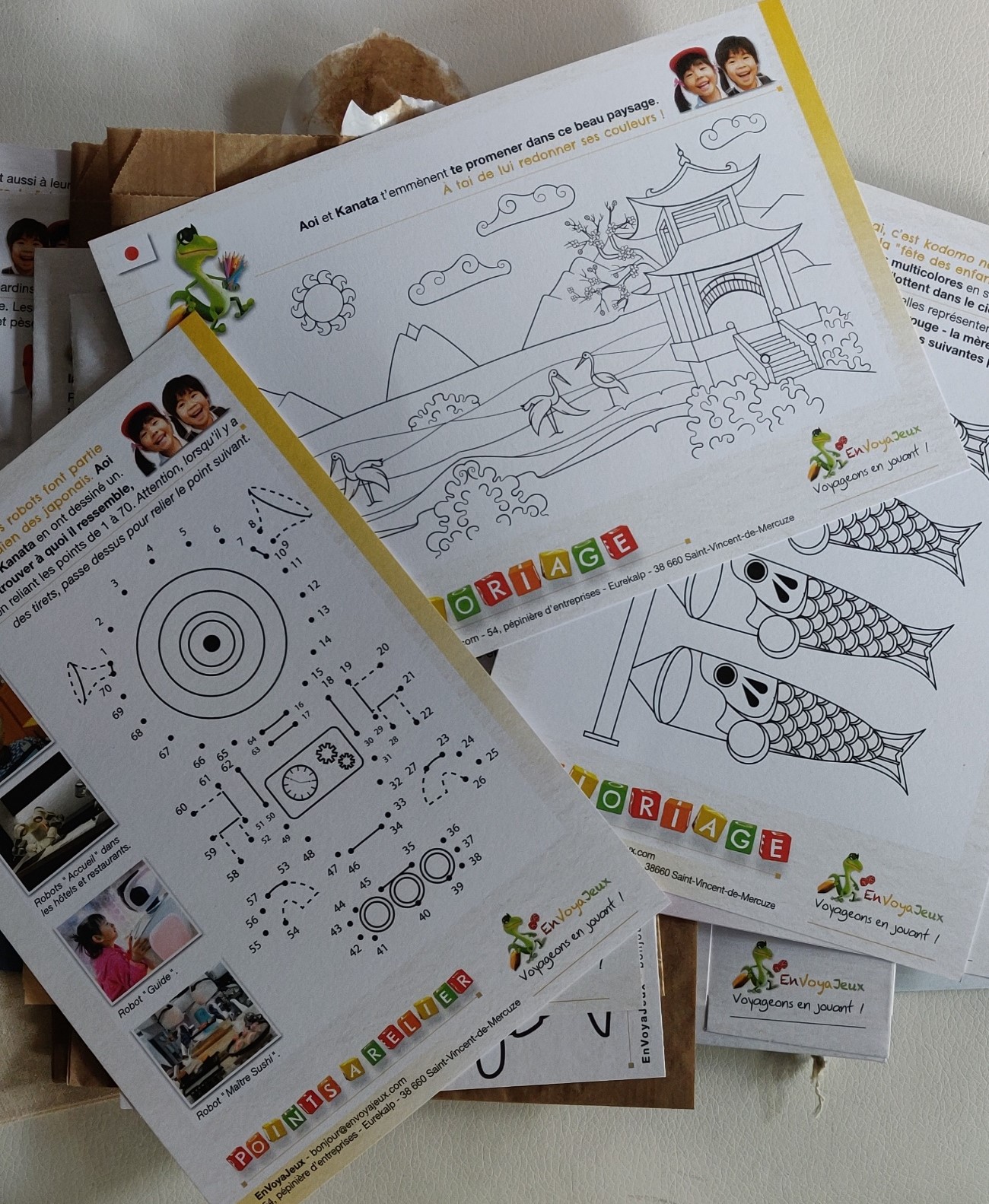 Pas besoin de beaucoup de matériel non plus pour s’amuser avec les enfants : ici par exemple le papier origami est fourni, tout comme le dohyo à construire soi-même pour jouer au sumo chez soi ! Des coloriages sur le thème des carpes koï, d’un paysage japonais et d’un joli manekineko sont également offerts : à vous de laisser votre imagination faire le reste avec vos propres feutres et crayons. Cette box est réellement ludique puisqu’on nous explique simplement et clairement les informations à savoir sur le pays et pour nous aider à remplir les différents jeux (les mots à découvrir, le mots fléchés…). Et on vous invite même à cuisiner un super omuraisu ! Et si jamais vous souhaitez en apprendre encore davantage, on peut aller sur le site de Envoyageux, dans la rubrique ESPACE + où l’on peut continuer le voyage : découvrir d’autres informations culturelles et historiques, d’autres coloriages, d’autres origamis et d’autres recettes à réaliser ! Un bon plan pour occuper les enfants un après-midi ou plusieurs soirées. J’ai gardé de nombreux enfants et je pense que cela les aurait occupé sans problème et leur aurait plu car le plus de cette box, c’est bien l’interaction entre enfants et adultes. Et on s’amuse tout en apprenant, n’est-ce pas plus sympa ?