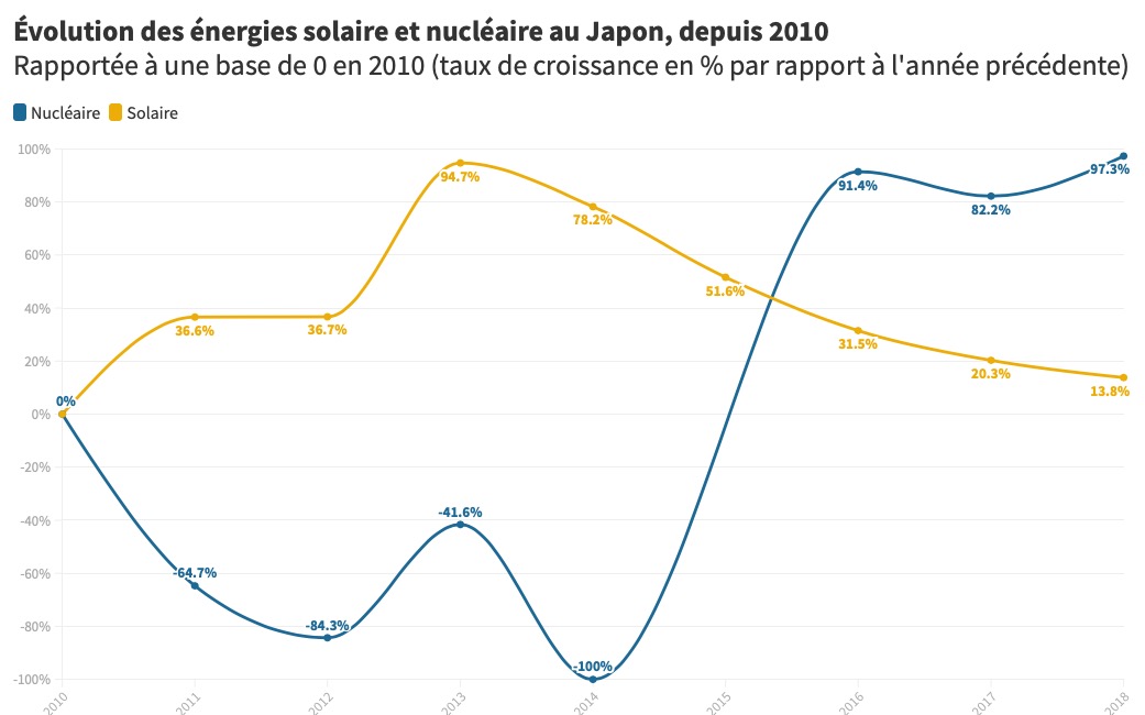 Taux de croissance des énergies nucléaire et solaire (Source : Agence japonaise des ressources naturelles et de l’énergie) – Infographie réalisée pour Journal du Japon
