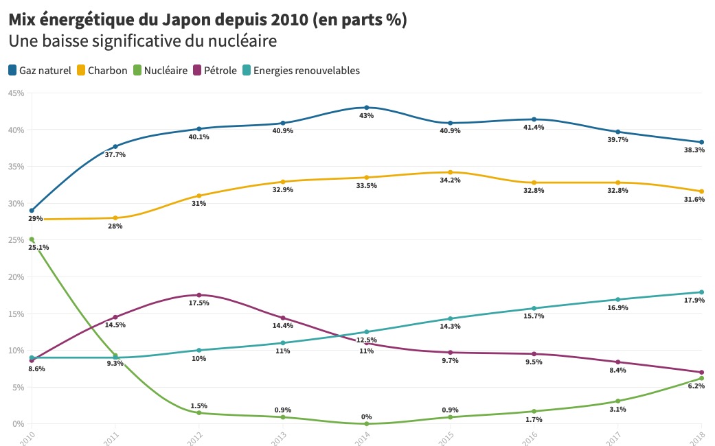 Mix énergétique du Japon de 2010 à 2018 (Source : Agence japonaise des ressources naturelles et de l’énergie) – Infographie réalisée pour Journal du Japon